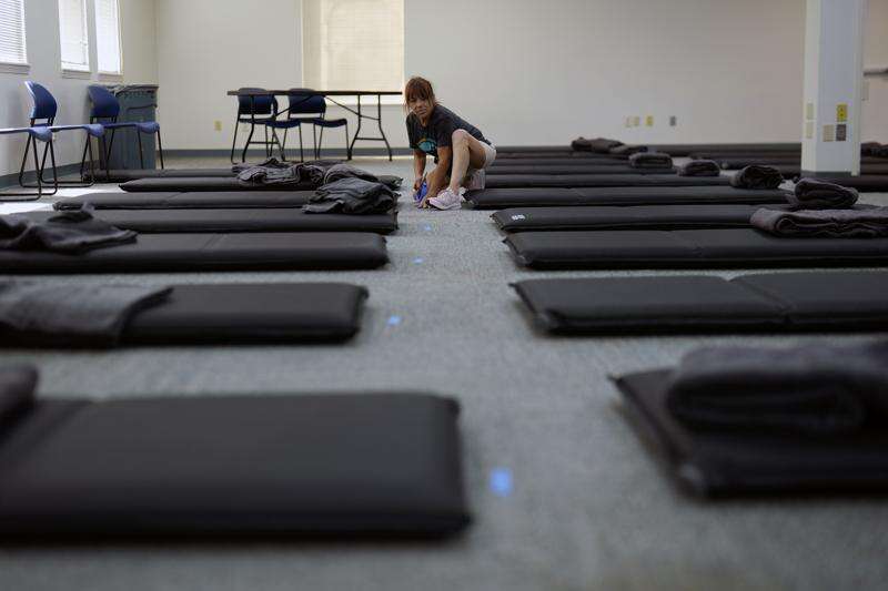 Doll Crain, with Cultivate Initiatives, marks off places for beds as workers set up the Cook Plaza cooling center on Friday, July 5, 2024, in Gresham, Ore. A heat wave is spreading across Wester U.S., the National Weather Service said, sending many residents in search of a cool haven from the dangerously high temperatures. (AP Photo/Jenny Kane)