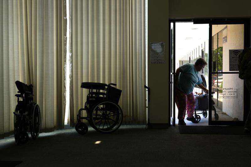 Sherri Thompson, with her Chihuahua 14-year-old Kiwahi, arrives at the Cook Plaza cooling center on Friday, July 5, 2024, in Gresham, Ore. Thompson has lived in her car for three years, and can only run its air conditioning for about 20 minutes at a time as it causes the engine to overheat. Thompson said the high temperatures prompted health concerns, as she had been hospitalized for a heat stroke in the past. A heat wave is spreading across Wester U.S., the National Weather Service said, sending many residents in search of a cool haven from the dangerously high temperatures. (AP Photo/Jenny Kane)