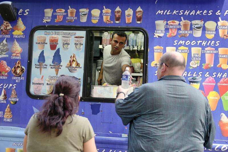 Wesam Horni, center, sells water on the National Mall near the U.S. Capitol, Friday, July 5, 2024, in Washington. (AP Photo/Mariam Zuhaib)