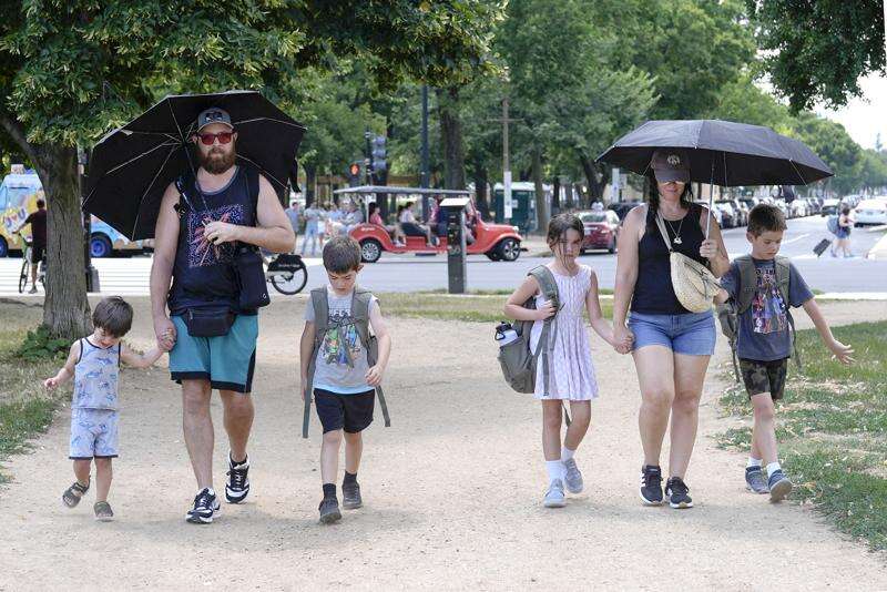 Jordan Savant, second from left, walks with his family carrying umbrellas on the National Mall near the U.S. Capitol, Friday, July 5, 2024, in Washington. (AP Photo/Mariam Zuhaib)