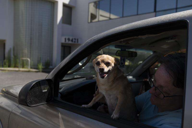 Sherri Thompson, with her Chihuahua 14-year-old Kiwahi, waits in her vehicle for the Cook Plaza cooling center to open on Friday, July 5, 2024, in Gresham, Ore. Thompson has lived in her car for three years, and can only run its air conditioning for about 20 minutes at a time as it causes the engine to overheat. A heat wave is spreading across Wester U.S., the National Weather Service said, sending many residents in search of a cool haven from the dangerously high temperatures. (AP Photo/Jenny Kane)