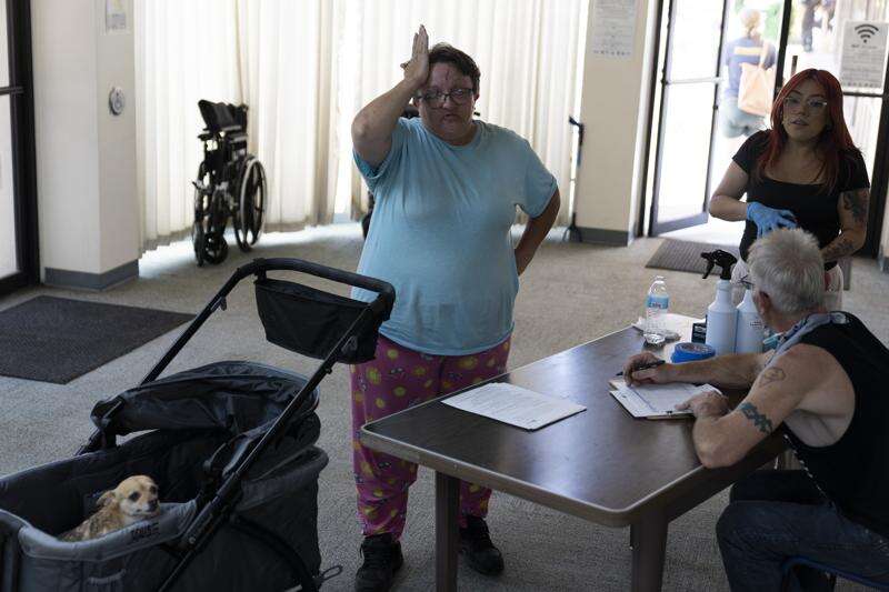 Sherri Thompson, with her Chihuahua 14-year-old Kiwahi, arrives at the Cook Plaza cooling center after waiting for the center to open on Friday, July 5, 2024, in Gresham, Ore. Thompson has lived in her car for three years, and can only run its air conditioning for about 20 minutes at a time as it causes the engine to overheat. A heat wave is spreading across Wester U.S., the National Weather Service said, sending many residents in search of a cool haven from the dangerously high temperatures. (AP Photo/Jenny Kane)