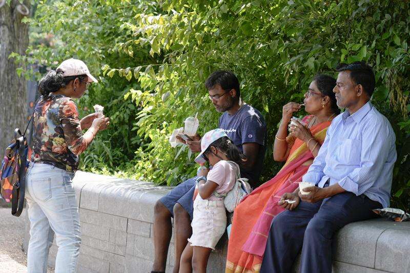 Radha Ramya, second from right, eats her ice cream with family members Nadamuni Ramya, from left, Dinakar Ramya, Nirvi Ramya and Devineni Ramya at the National Mall near the U.S. Capitol, Friday, July 5, 2024, in Washington. (AP Photo/Mariam Zuhaib)