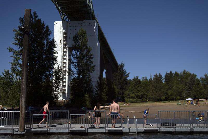 People walk on the dock at Cathedral City Park on Friday, July 5, 2024, in Portland, Ore. A slow-moving and potentially record-setting heat wave is spreading across the Western U.S., sending many residents in search of a cool haven from the dangerously high temperatures. (AP Photo/Jenny Kane)
