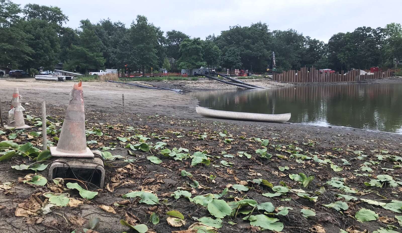 Work on the dam also yielded a surprise. After draining the lake six feet to install sheet piling, a cement wall below the surface with winged sides was encountered below the lake bed. The lake was lowered another two feet before work resumed.