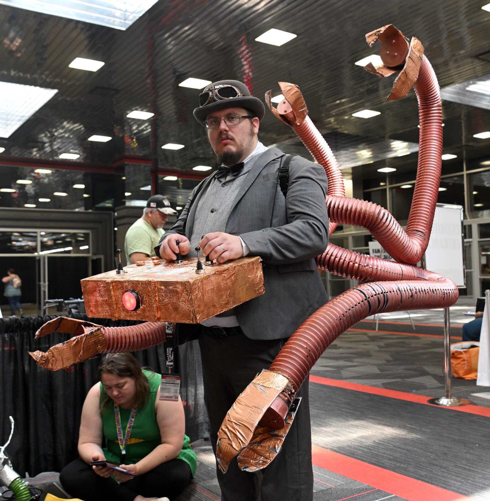 AJ Conte of Madison Heights, Michigan. is dressed as Doctor Octopus from “Spider-Man” during the Fan Expo Chicago comic and pop culture convention Saturday at the Donald E. Stephens Convention Center in Rosemont.