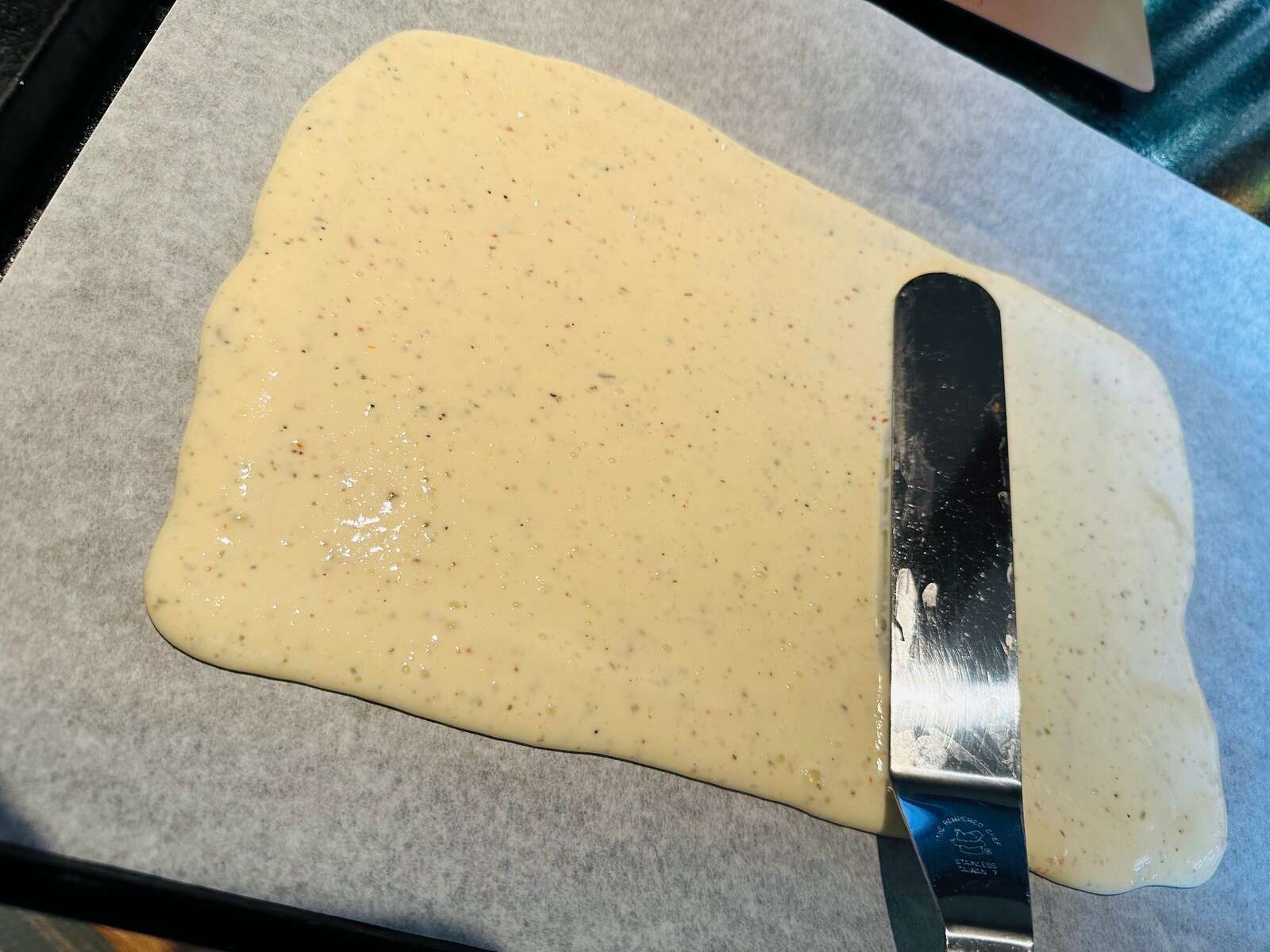 I put everything into a quart container and blended it using my immersion blender. This was easier for me than using my larger beverage blender and worked well. The mixture should resemble a thick pancake batter. Next, I have two tips I found most important to the success of my wrap: line your baking pan with parchment sprayed with cooking oil and carefully spread the batter as evenly as possible, ensuring even baking. Please trust me on both of these as I speak from experience. Several of my test batches didn’t turn out well when I didn’t follow these parts of the recipe. Before baking, I also sprinkled a little extra Italian seasoning over the top.