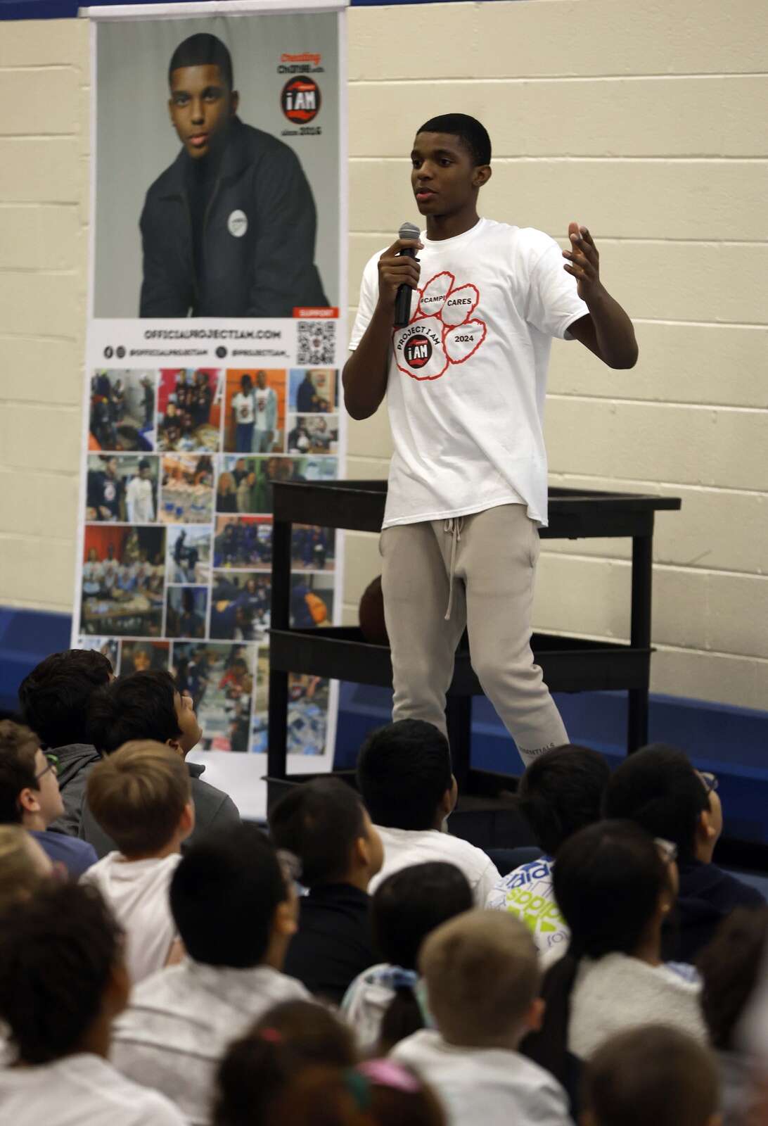 Chicago teen Jahkil Jackson helped students create care packages and spoke to them about how he was spurred at the age of 5 to work with charities devoted to assisting unhoused individuals and created the not-for-profit Project I Am three years later.