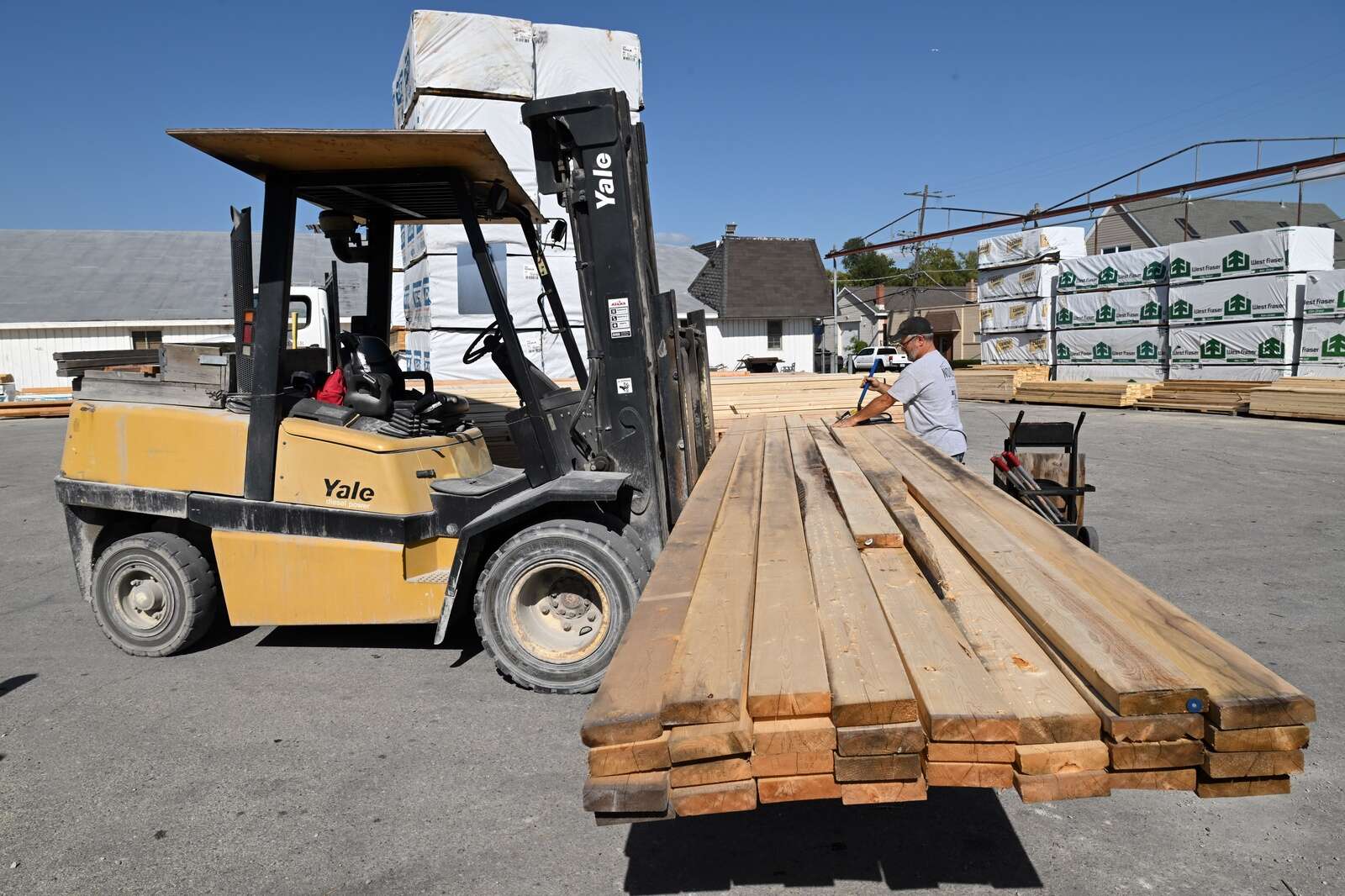 Tim Werner adds strapping to lumber while working in the yard at Heller Lumber in Arlington Heights.
