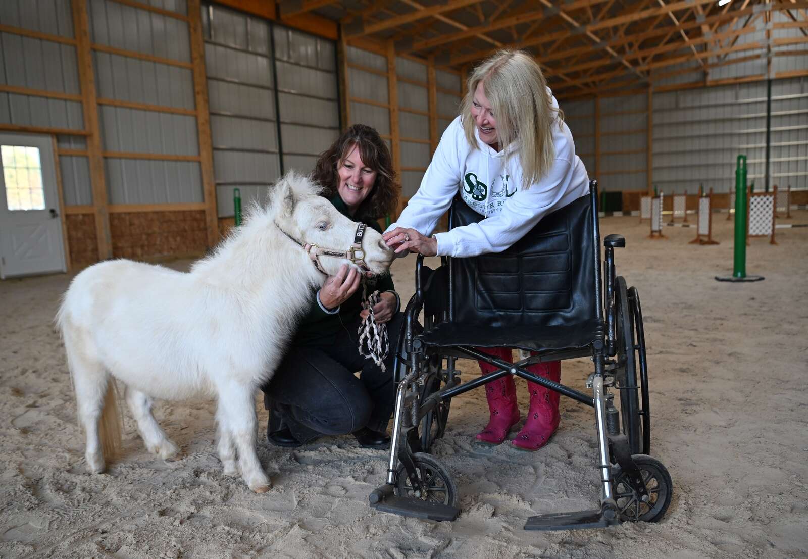 Claire Johnson, left, and Jodie Diege demonstrate how a miniature horse like Buttercup can meet a person in a wheelchair at Soul Harbour Ranch in Barrington on Wednesday, Oct. 16, 2024. The Barrington Chamber of Commerce recently hosted a ribbon-cutting ceremony for Soul Harbour Ranch’s newly-completed 60x120 Training Center, donated by the Foglia Family Foundation.