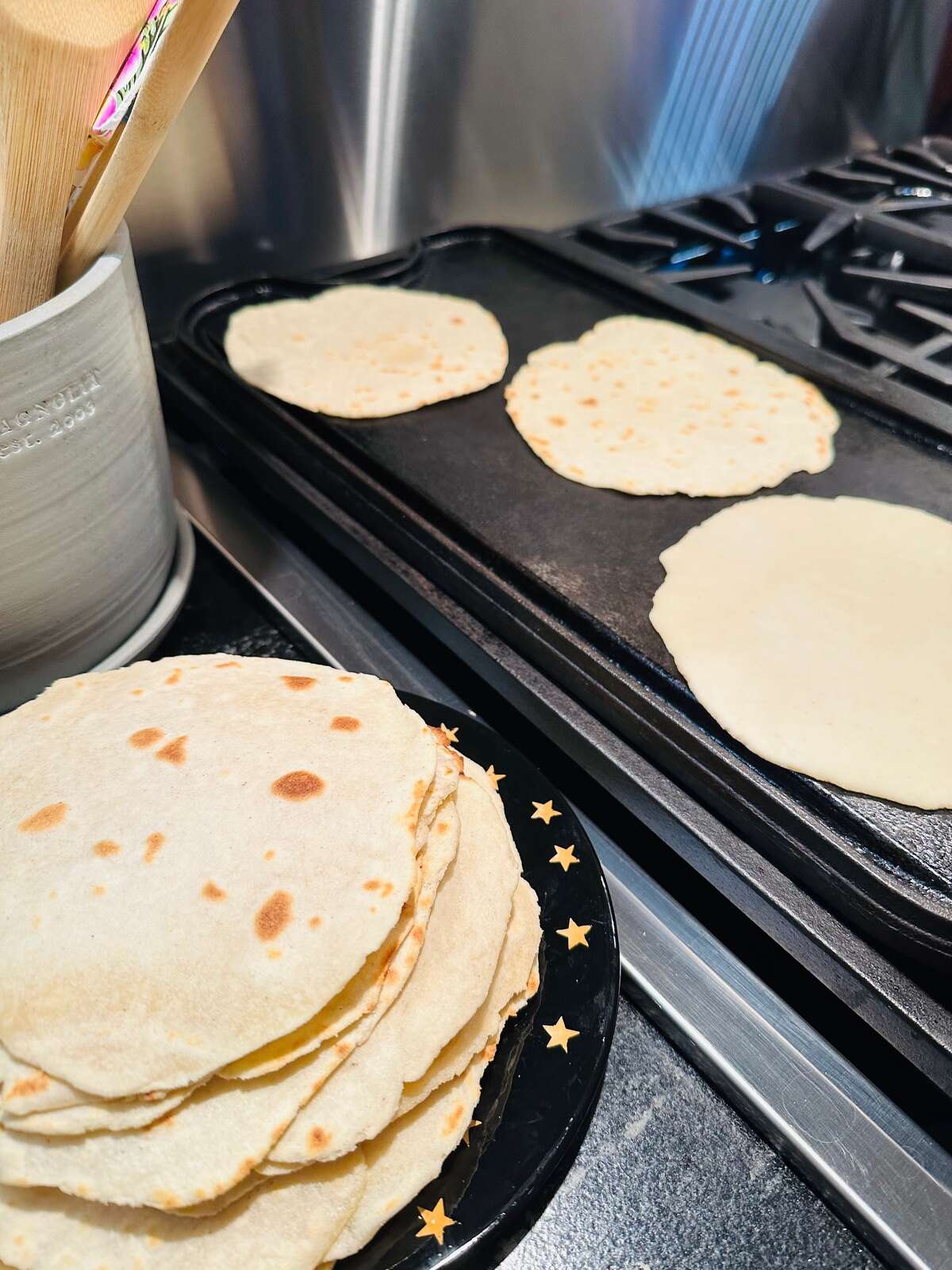 Place rolled dough into dry hot pan and cook until small brown spots form, approximately 45 to 60 seconds; flip and cook on the second side. Remove to a plate. Continue with other tortillas. I was able to roll out the next tortilla while the prior cooked, so the entire cooking process didn’t take very long. Tortillas can be made ahead of time and reheated quickly in a hot pan.
