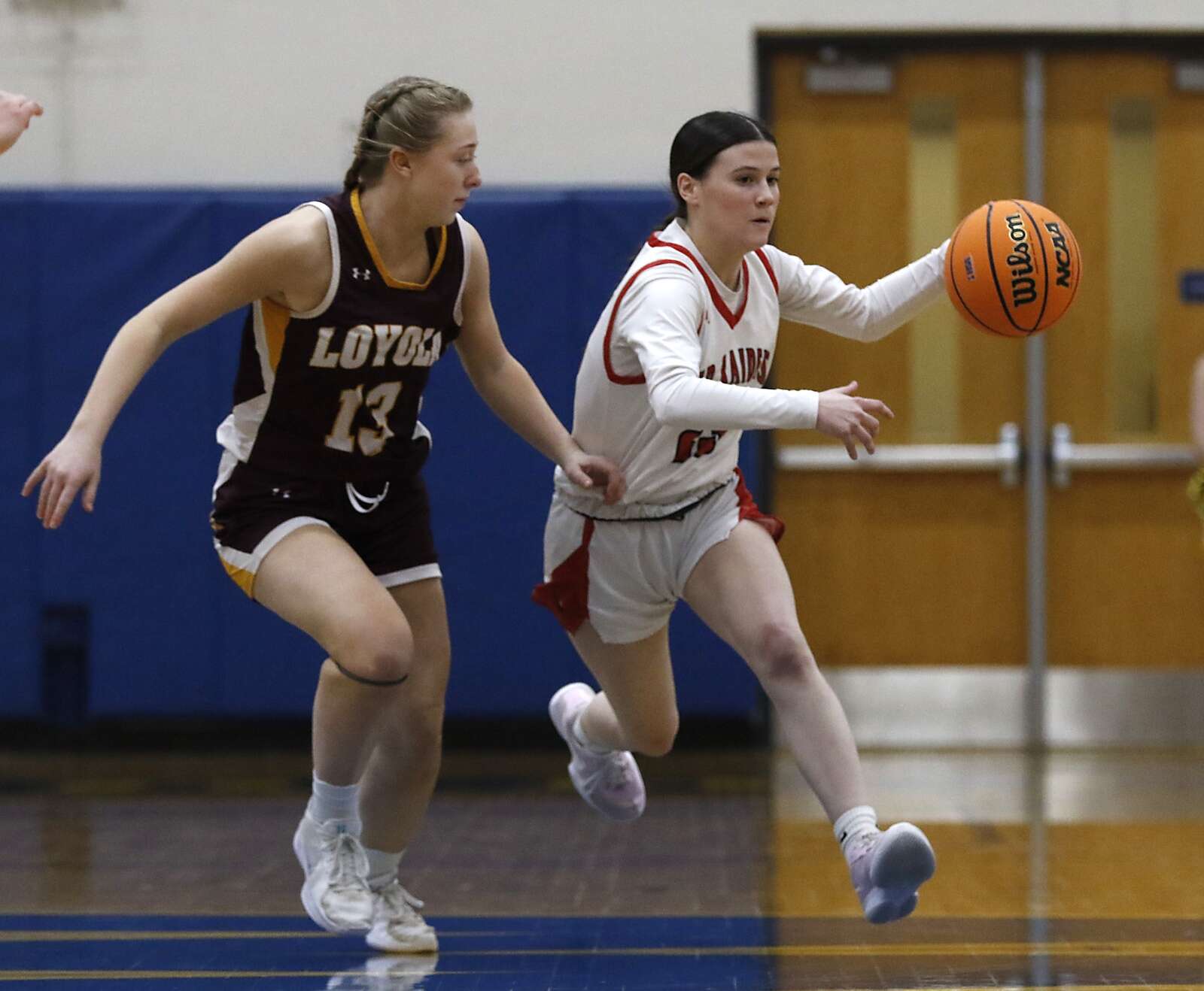 Huntley's Ava Mcfadden looks to pass as she is defended by Loyola Academy's Grace Bronski during the IHSA Class 4A Gurnee Warren Supersectional girls basketball game on Monday, March 3, 2025, at Warren Township High School in Gurnee.