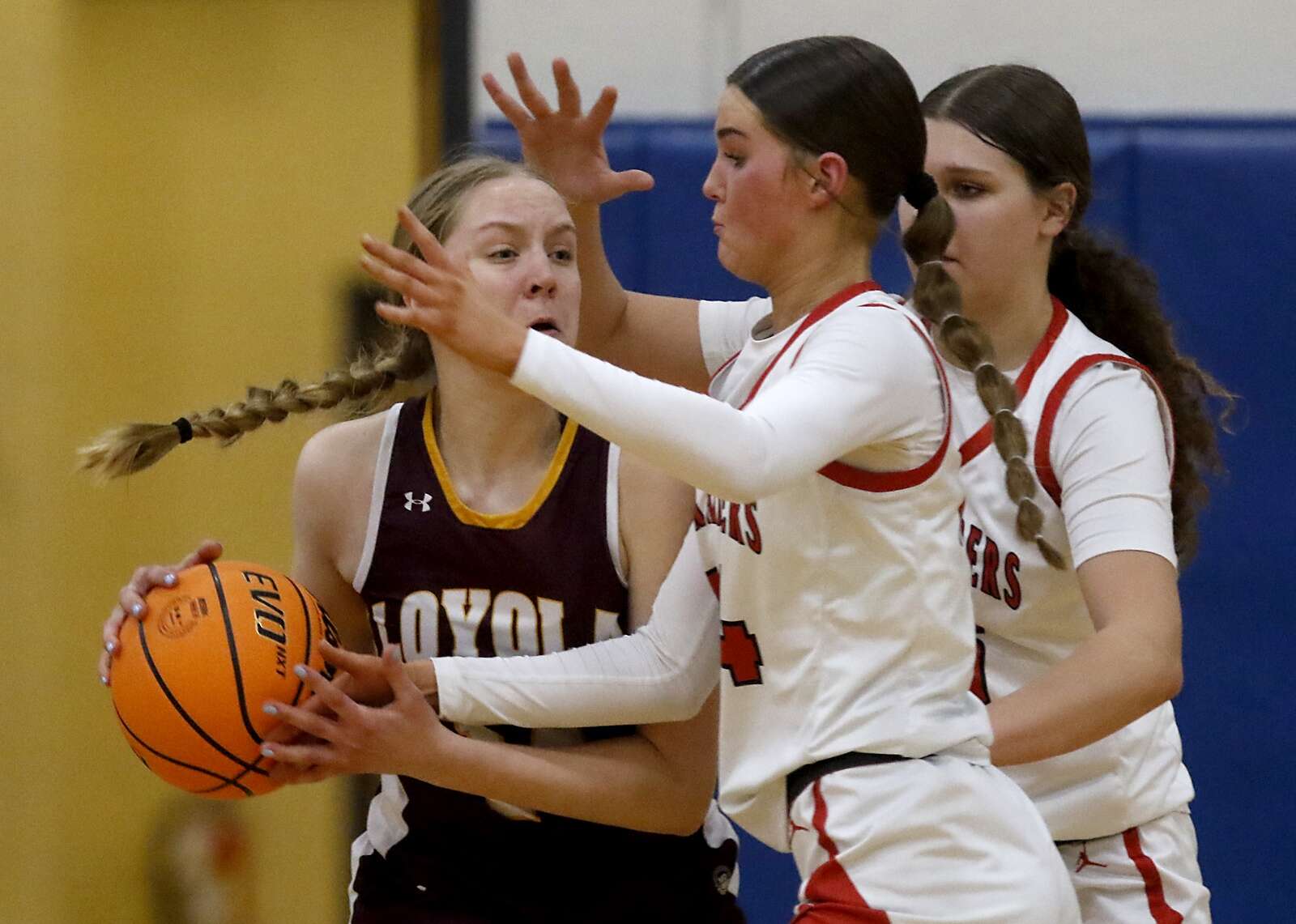 Huntley's Anna Campanelli tries to steal the ball from Loyola Academy's Clare Weasler as she is picked by Loyola Academy's Emily Naraky during the IHSA Class 4A Gurnee Warren Supersectional girls basketball game on Monday, March 3, 2025, at Warren Township High School in Gurnee.