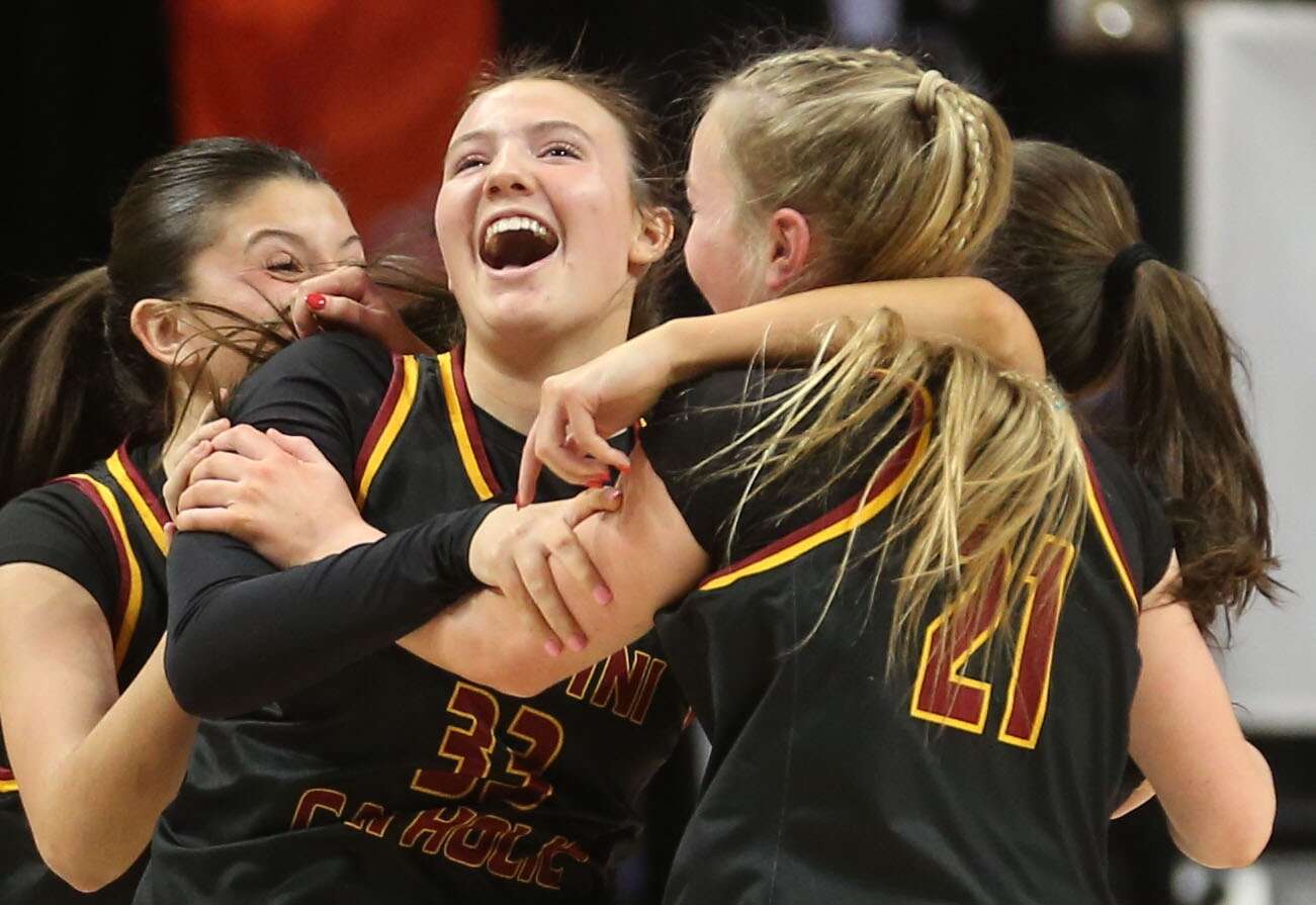Members of the Montini girls basketball team react after defeating Quincy Notre Dame during the Class 3A State semifinal game on Thursday, March 6, 2025 at CEFCU Arena in Normal.