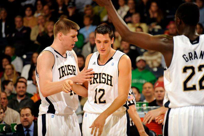 Notre Dame guard Alex Dragicevich, right, celebrates Tuesday with teammate Jack Cooley. Notre Dame won 72-59 with Dragicevich scoring 22 points and Cooley 8 points. Associated Press