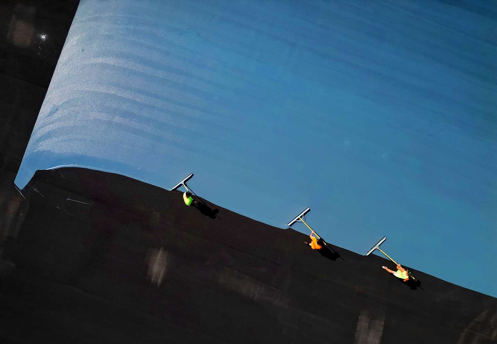A crew of three men with squeegees spread an acrylic surface on the Palatine High School tennis courts in July. The sun reflecting on the left edge gives the scene a three-dimentional look. The site of a dozen courts will be a host of the IHSA state tennis championship series later in the school year.