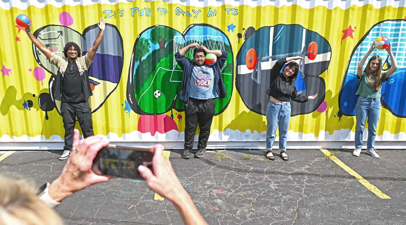 Avrie Lilly, 18, left, Malcolm Wilson, 17, and Gia Mangriotis, 16, right, are pictured with Annabelle Mique of Alignment Collaborative for Education in front of a mural the three high school students painted at the YMCA in Elgin.