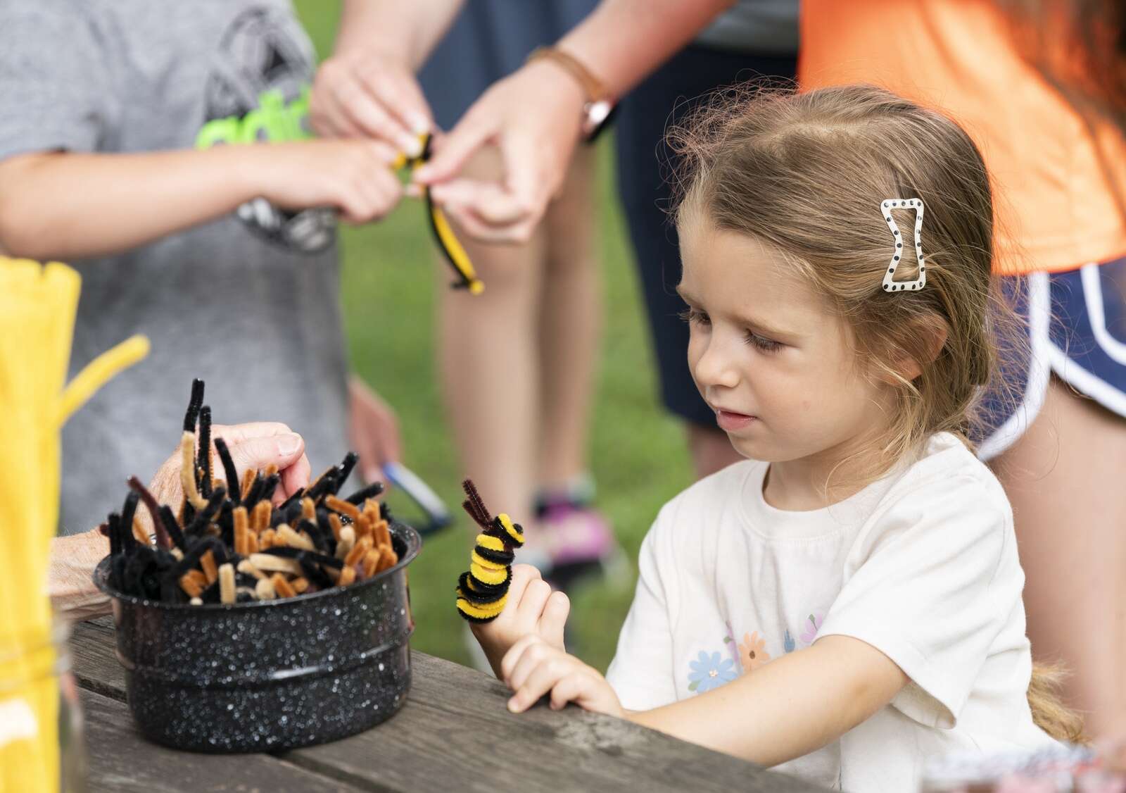 Penelope Fierros, 3, of Arlington Heights, makes a bee finger puppet craft with pipe cleaners during Honey Fest on Sunday, August 17, 2025 at Heritage Farm at Spring Valley in Schaumburg. The free event celebrated all things honey, including the bees who make it, with historic demonstrations, crafts and honey tastings.