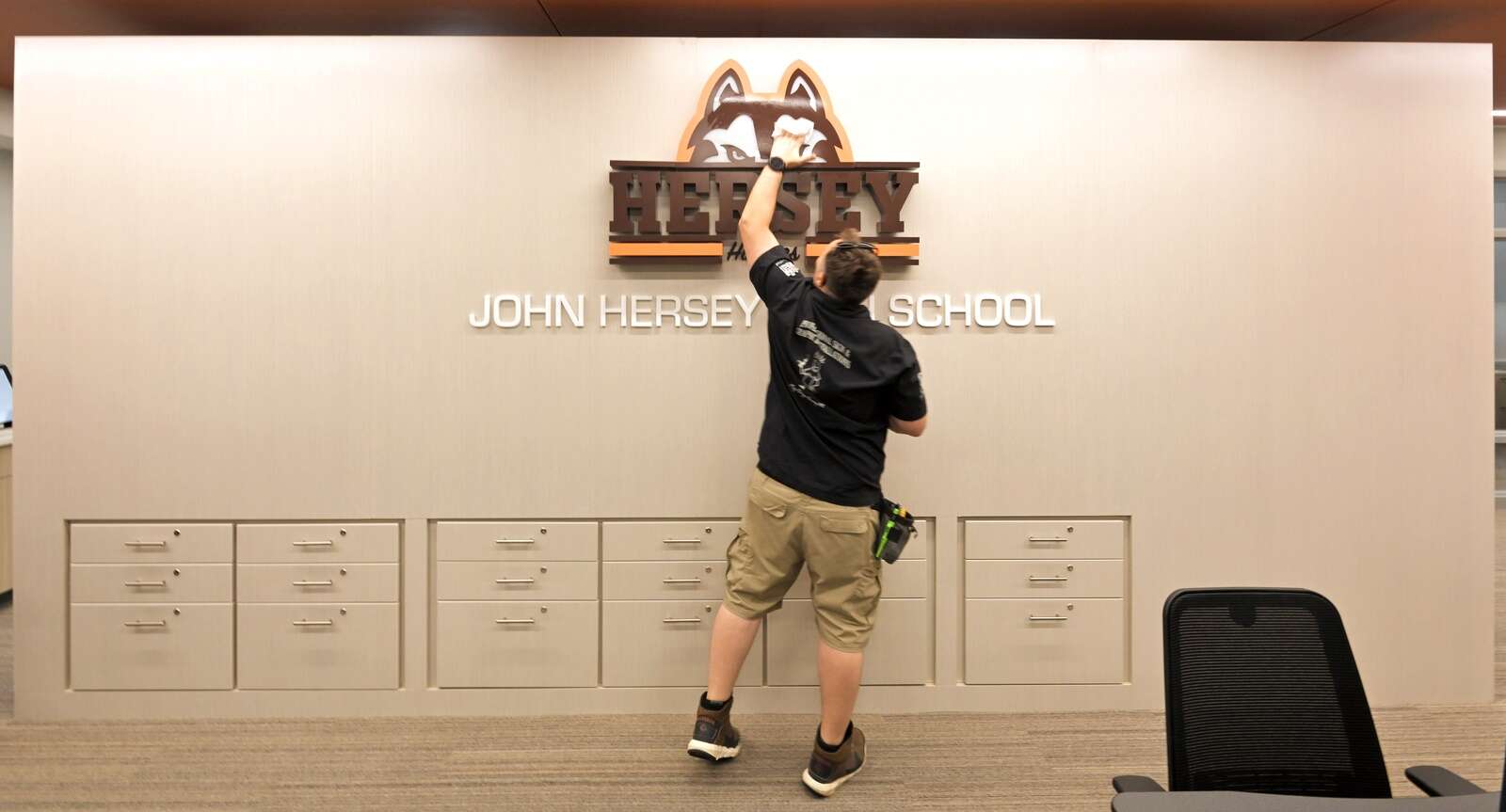 A sign in the main office gets cleaned at a ribbon cutting event to show off the new $3.5 million transformation of the main foyer and front offices at John Hersey High School in Arlington Heights on Wednesday, August 8, 2025.