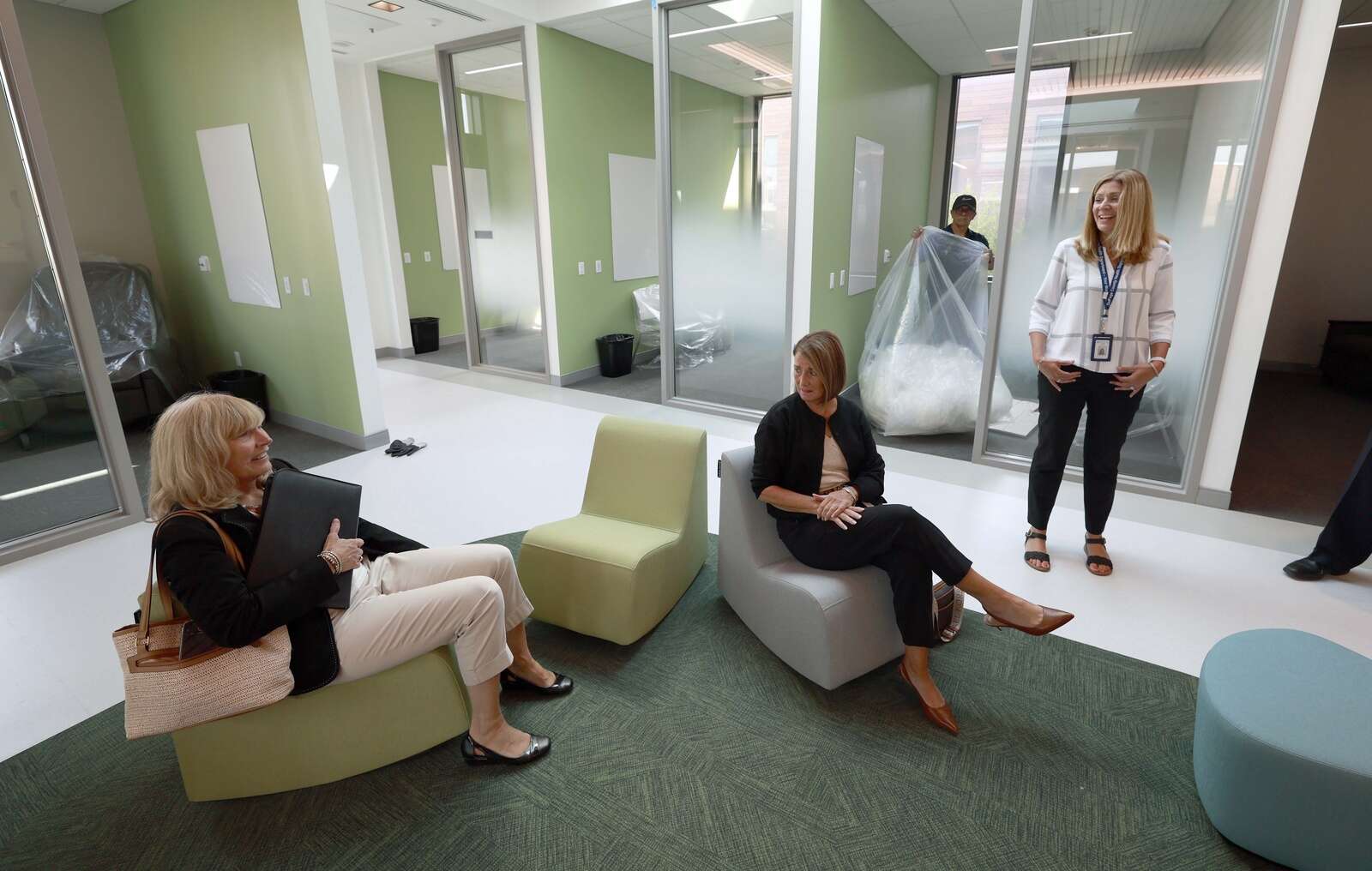 Joan Olson, chief communications officer for DuPage County, left, DuPage County Board Chair Deb Conroy and Deputy Director Behavioral Health Services Lori Carnahan, standing at right, test some of the new furniture in the children’s service area at the new DuPage County Crisis Recovery Center Wednesday, Aug. 6, 2025 in Wheaton. The center will serve as an alternative to hospital emergency rooms. Family members, emergency medical services workers and law enforcement officials will be able to bring adults and young people experiencing a mental health or substance use crisis to the new facility.