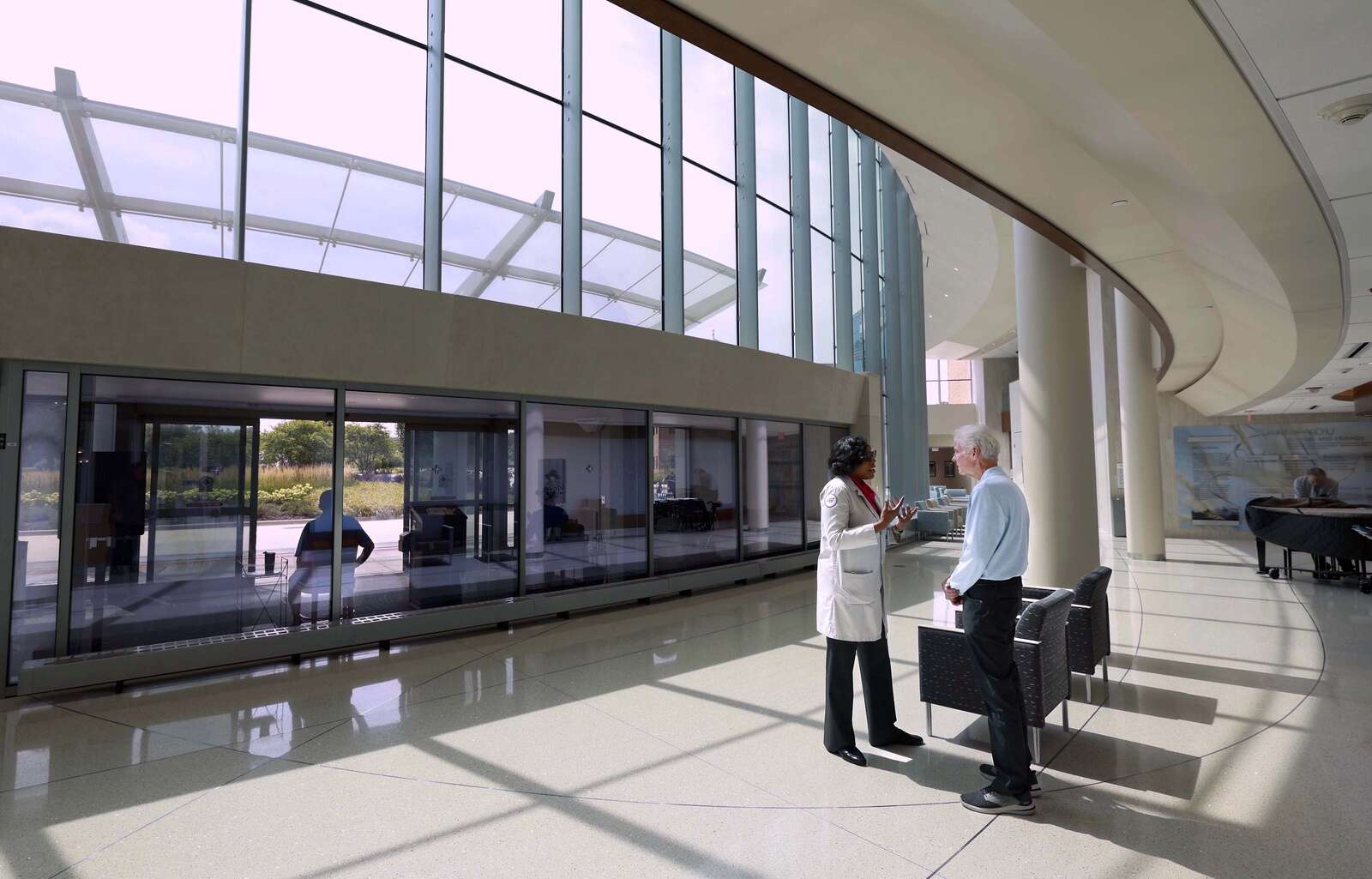Larry Stoklosa, of Palatine sees Dr. Jacqueline Ivey-Brown, an internal medicine physician at Advocate Health Care and Chief Medical Officer of the North Illinois Area, for the first time Tuesday, Aug. 12, 2025 in Barrington for the first time since Dr. Ivey-Brown helped save his life on a flight in May that originated in Italy.