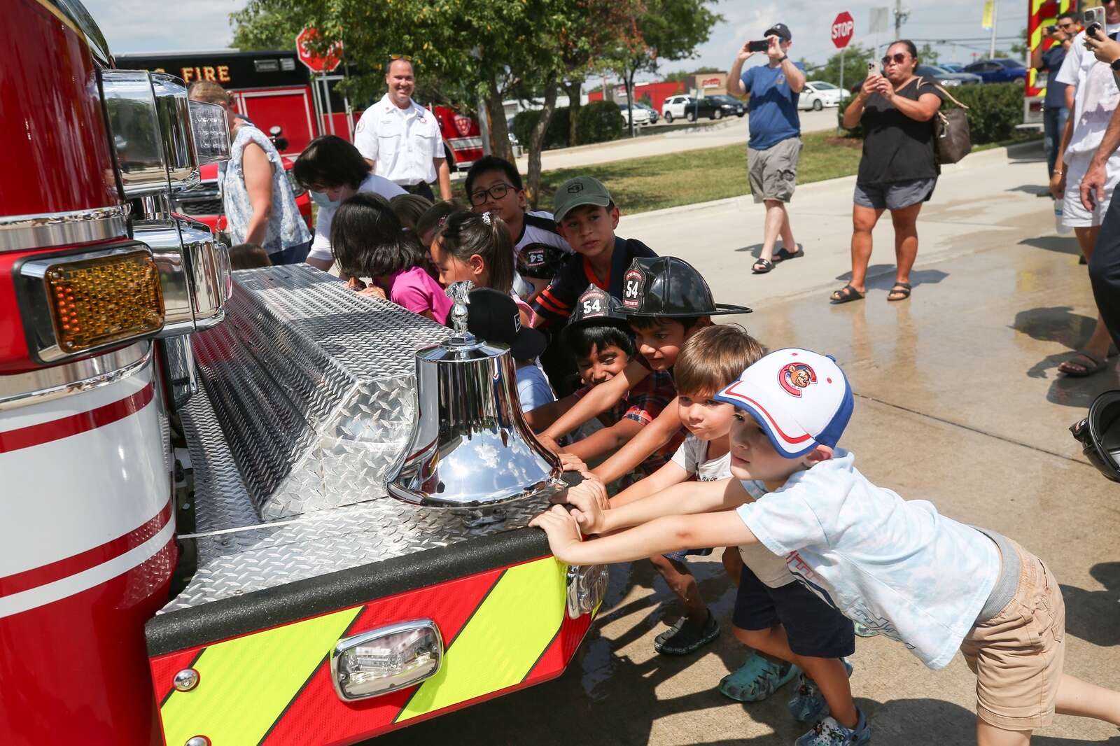 Kids help push the newly-welcomed Tower 52 fire truck into station 52 of the Schaumburg Fire Department, at the Wet Down Dedication Ceremony.