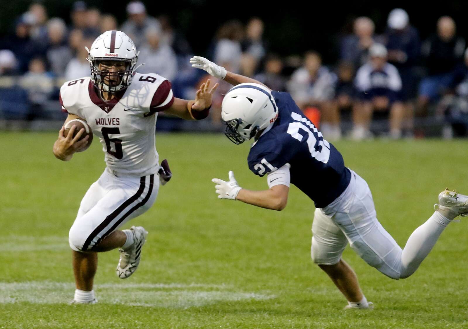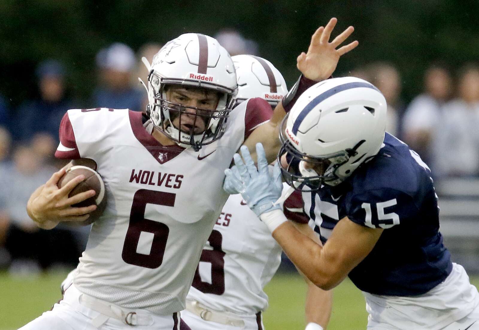 Prairie Ridge's Luke Vanderwiel tries to get away from the pursuit of Cary-Grove's Jason Ritter Jr. during a Fox Valley Conference football game on Friday, Aug. 29, 2025, at Cary-Grove High School in Cary. Gregory Shaver