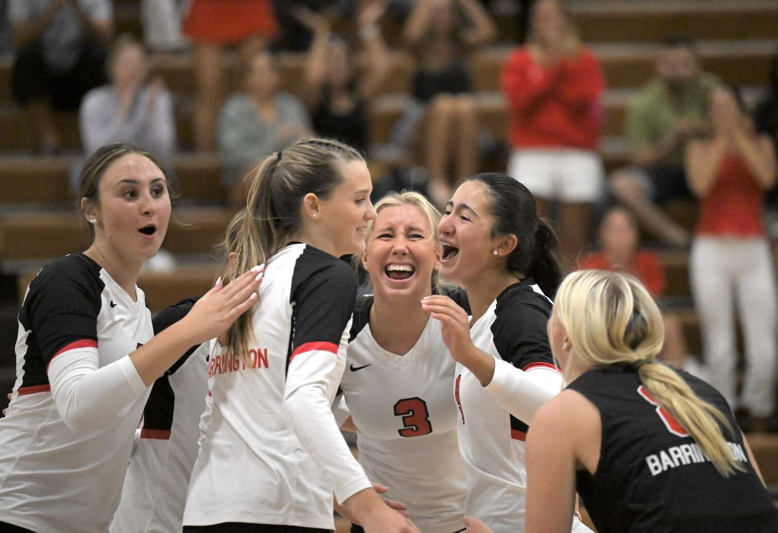 Barrington rallied from a 10-5 deficit in the third set before pulling out the match with the final two points coming on Jaelyn Connole's set to Kaelyn Brookbank for the 24th point and Connole's ace to win it.