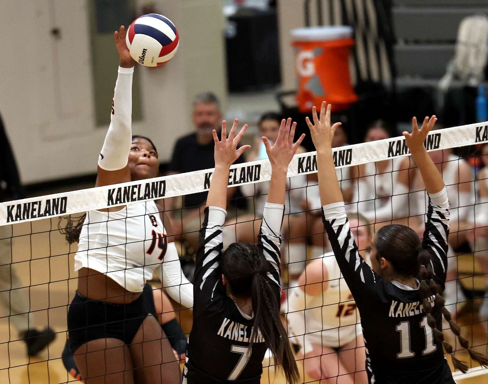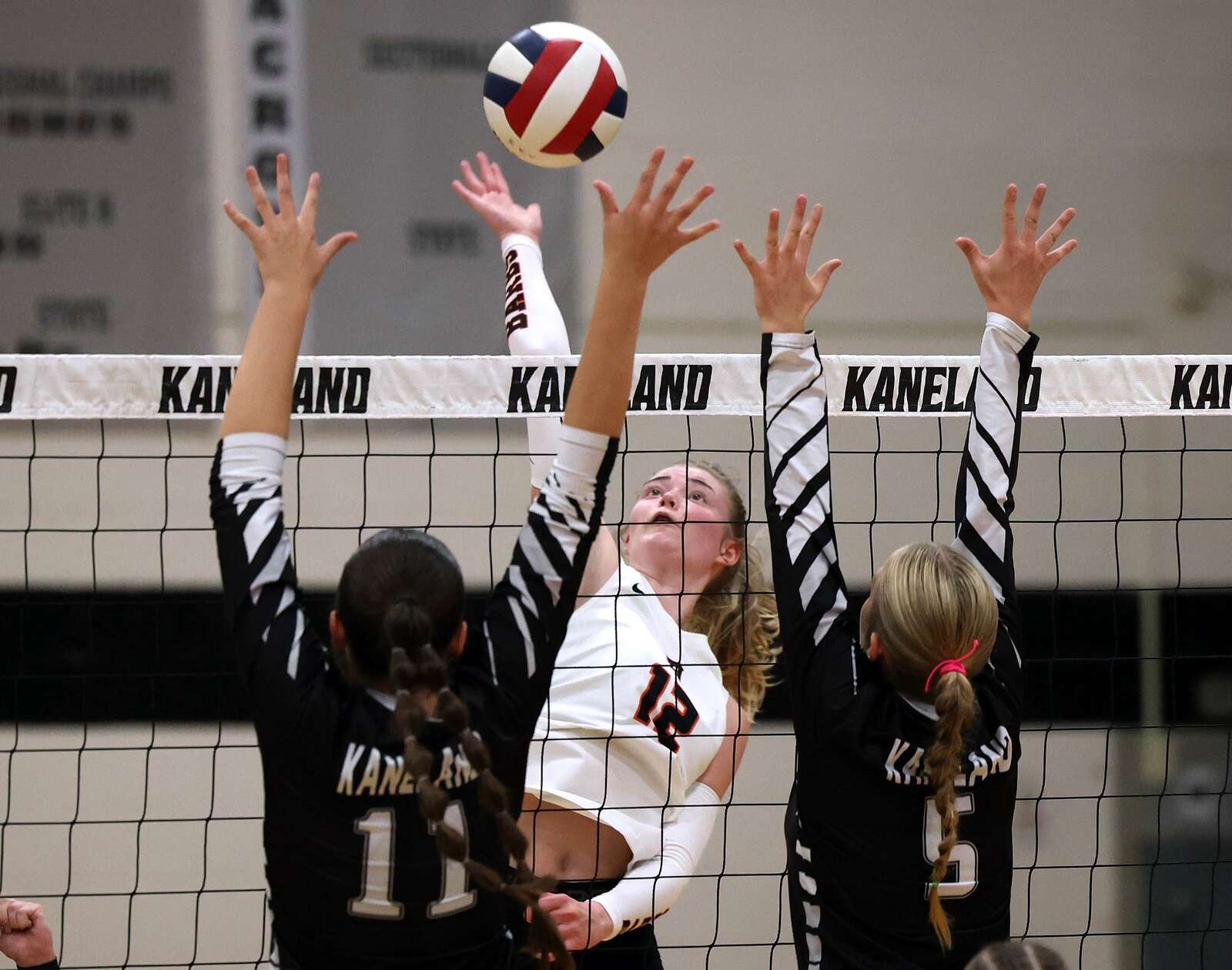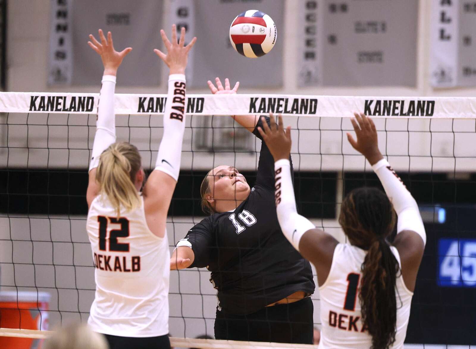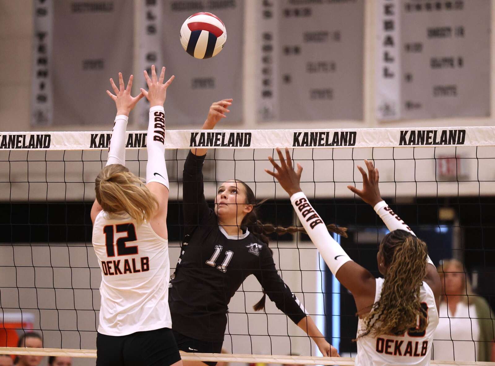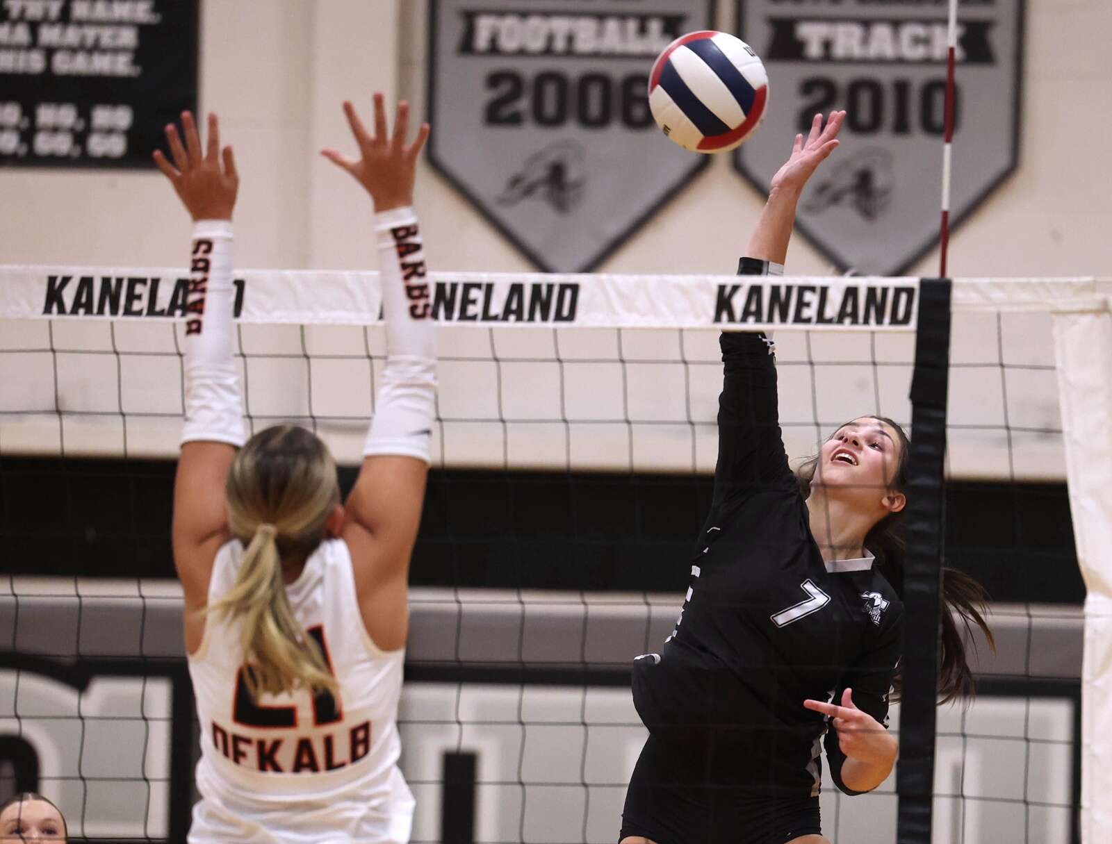 After Kaneland senior Abi Carter’s ace cut DeKalb’s lead to 23-22 in the opening set, the Barbs answered with a kill from Grant followed by a blistering serve from junior Maddi Hollar that the Knights couldn’t return.