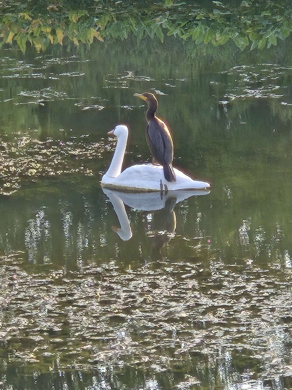 An honorable mention goes to Sandy Dubick of Round Lake Heights for her eye-catching photo of a Double-breasted Cormorant catching some rays while perched on a decoy swan.