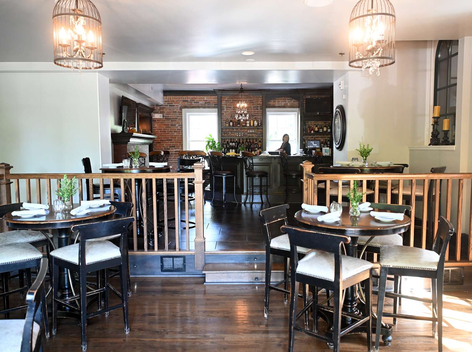 The downstairs features multiple dining spaces and a bar in various rooms of the former house. A front dining room includes a cozy fireplace, while one near the bar features high-tops and lots of windows.