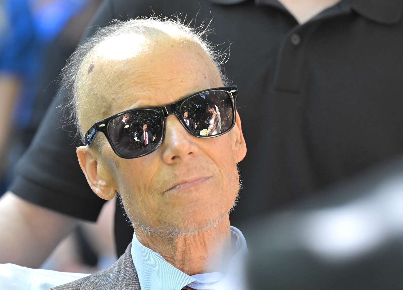 He wore a light brown suit, boutonnière pinned to the lapel, black sunglasses and a beaming smile.