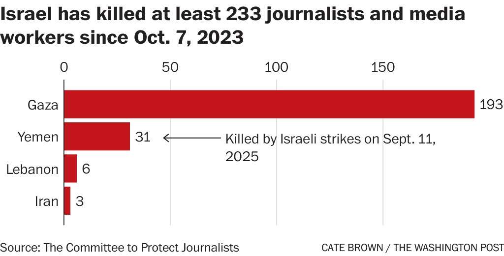 According to CPJ’s count, the Israeli military has killed at least 233 journalists and media workers across Gaza, Lebanon, Iran and Yemen in conflicts that have spanned the region since the Oct. 7, 2023 Hamas attack on Israel.