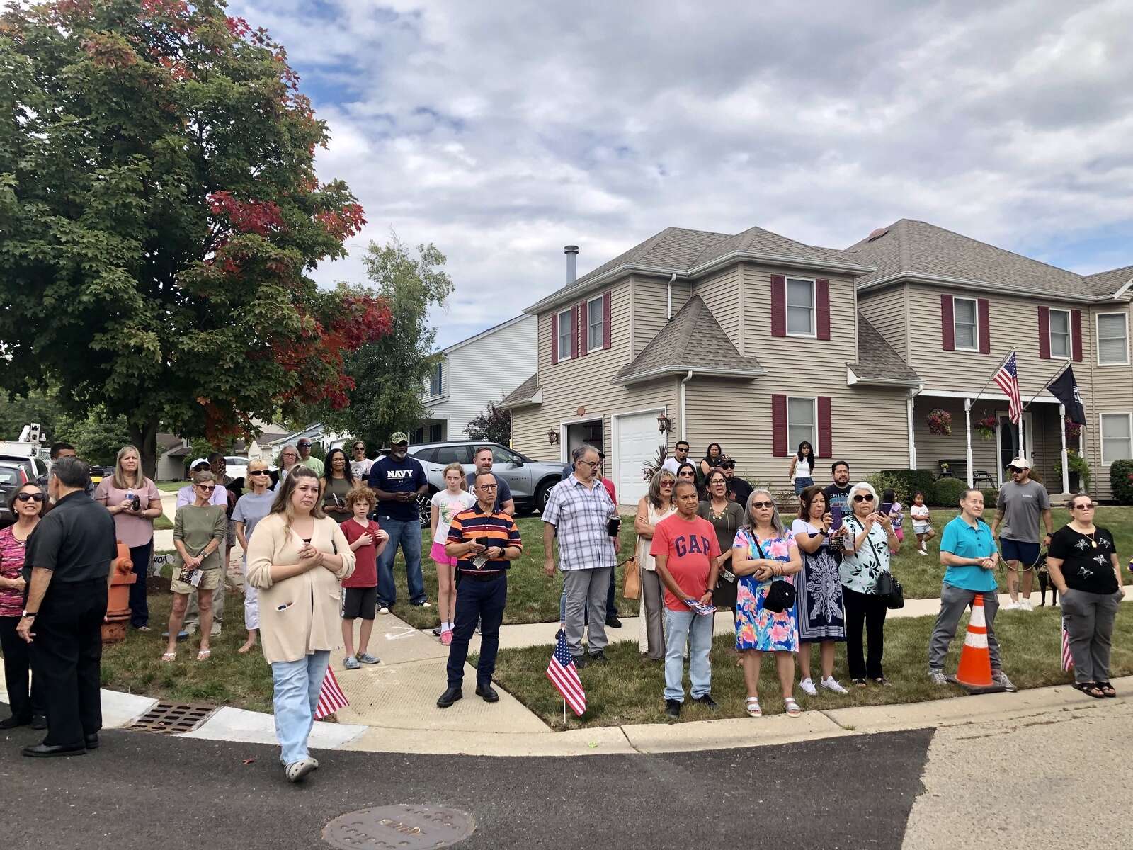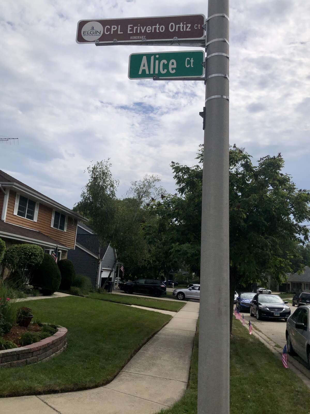 Well-wishers from Elgin and as far away as Georgia gathered Saturday outside Valle’s home to watch her street, Alice Court, receive the honorary name of “CPL Eriverto Ortiz Court.”