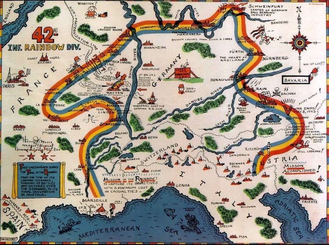 Oddly, the Rainbow Division’s march through Europe during World War II vaguely resembles the arc of a rainbow as well.