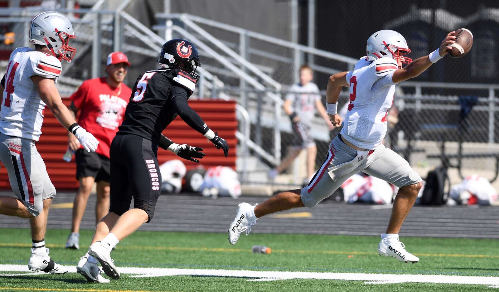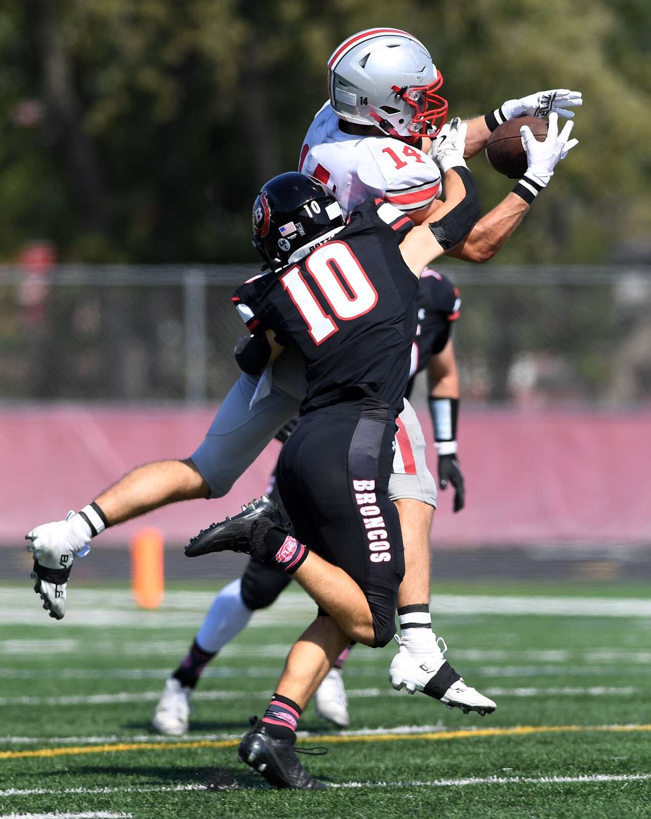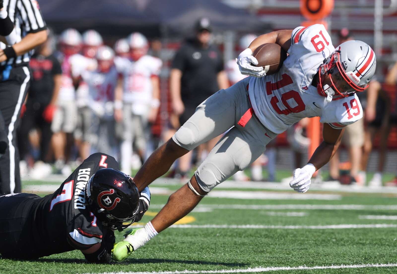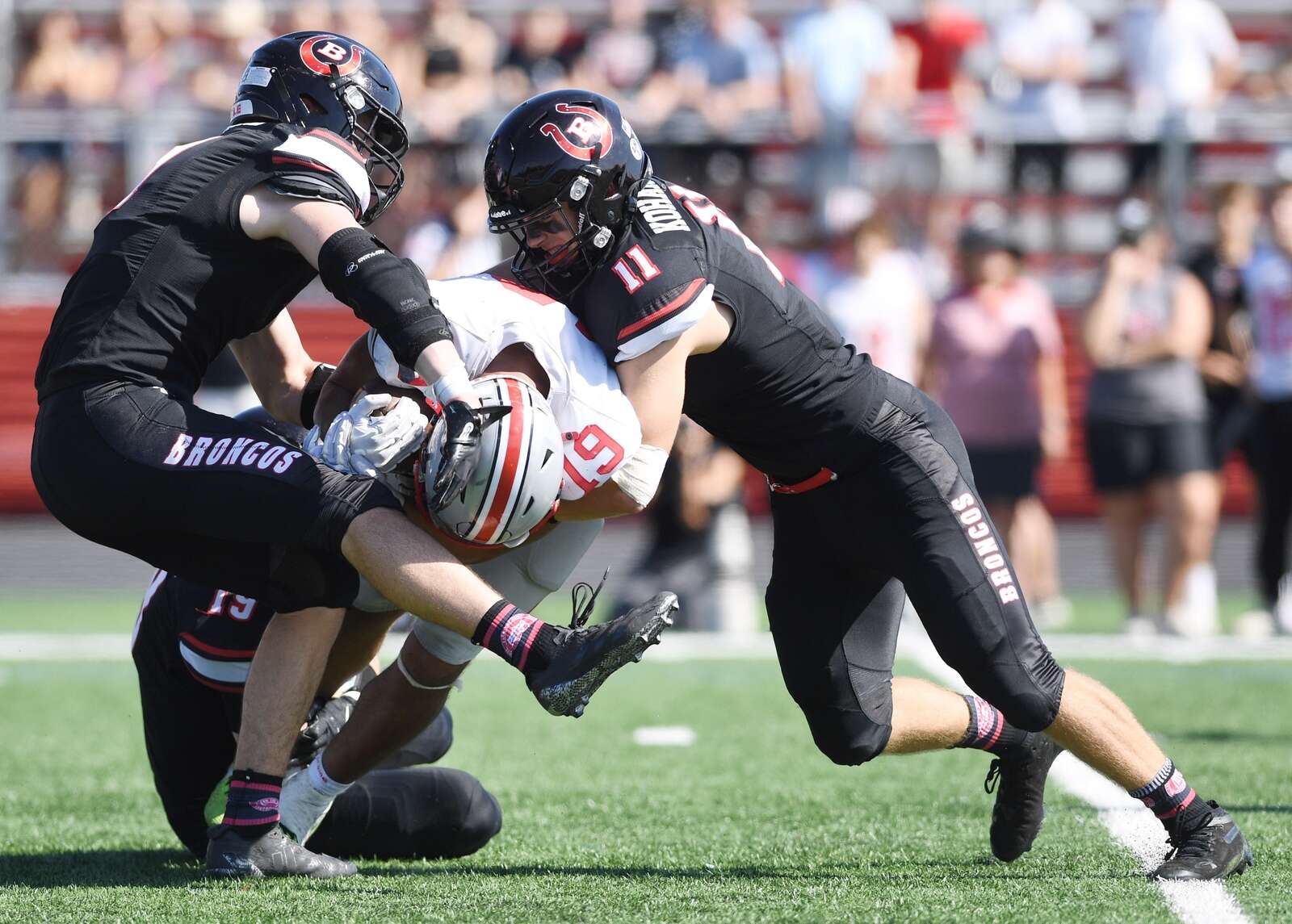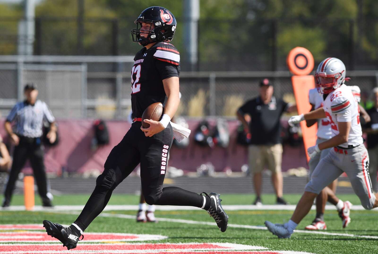 Each of Saturday’s 9 TDs came via a rush. Tepas found the end zone on a pair of 1-yard bursts and a 13-yard, third-quarter gallop; Osterhues’ other scoring run covered 5 yards; Broncos senior running back Cameron Massillo capped the day’s scoring — one play after Broncos senior linebacker Jett Kohanzo’s interception — with a 1-yard TD run 58 seconds shy of the fourth quarter.