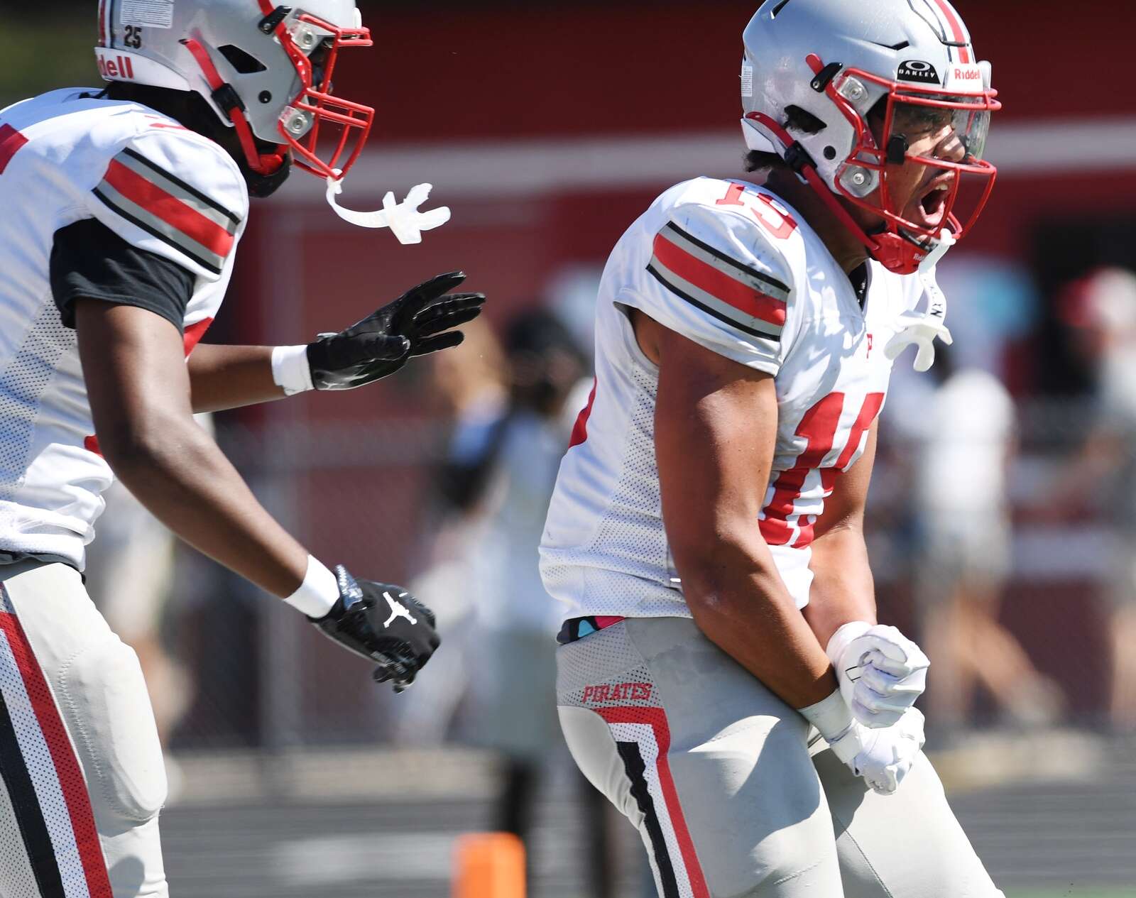 Pirates senior wideout/safety Kole Fager caught 7 balls for 113 yards before suffering what appeared to be a serious shoulder injury at the end of Kohanzo’s interception return. He had to sit out the fourth quarter.