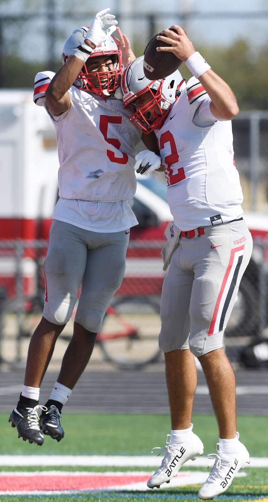 Palatine quarterback Will Santiago, right, celebrates a third-quarter touchdown with teammate Jayden Evans during the third quarter of Saturday’s game at Barrington. Joe Lewnard/jlewnard@dailyherald.com
