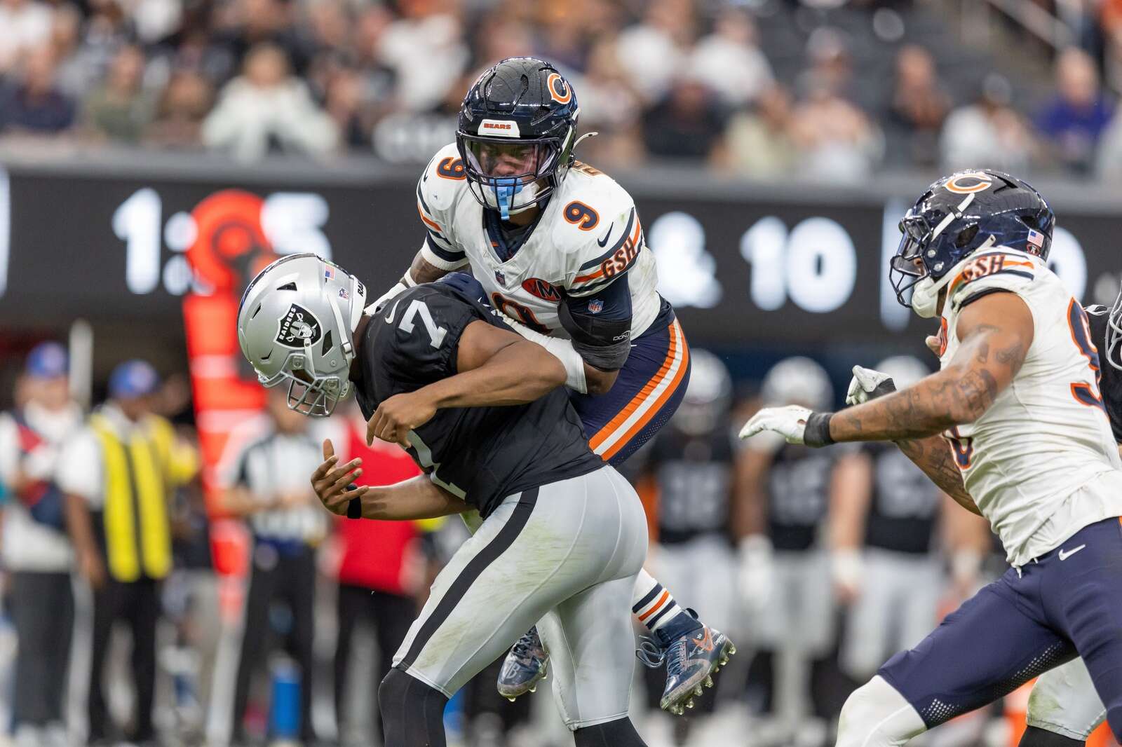 Bears defensive back Jaquan Brisker hits Las Vegas Raiders quarterback Geno Smith during Sunday’s game. AP
