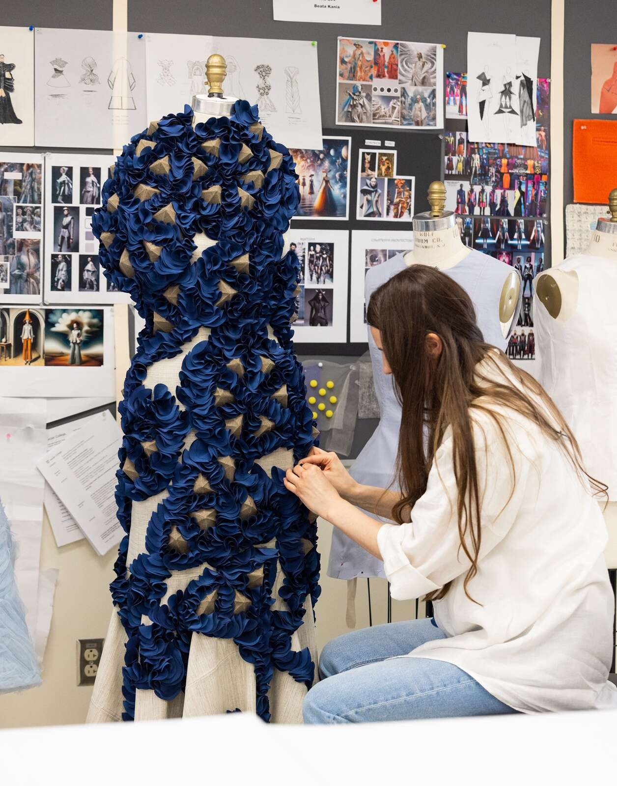 Harper student Katsiaryna Piatsevich laser cut an untold number of 2-inch blue fabric circles before embarking on the painstaking process of hand-sewing each one into winding patterns on a dress. Courtesy of Harper College