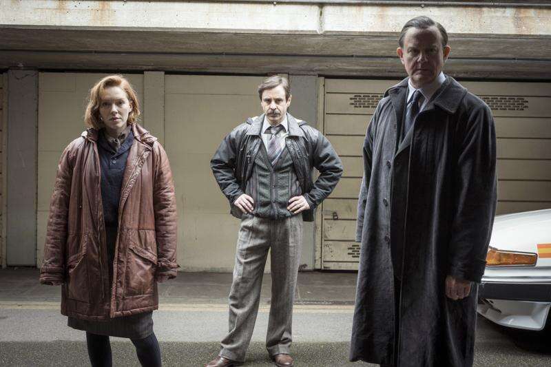 Nicki Jennings (Charlotte Spencer), left, Tony Brightell (Emun Elliott) and Brian Boyce (Hugh Bonneville) work to solve the mystery of who stole 26 million pounds worth of gold bars in “The Gold.” Courtesy of All3Media and Masterpiece