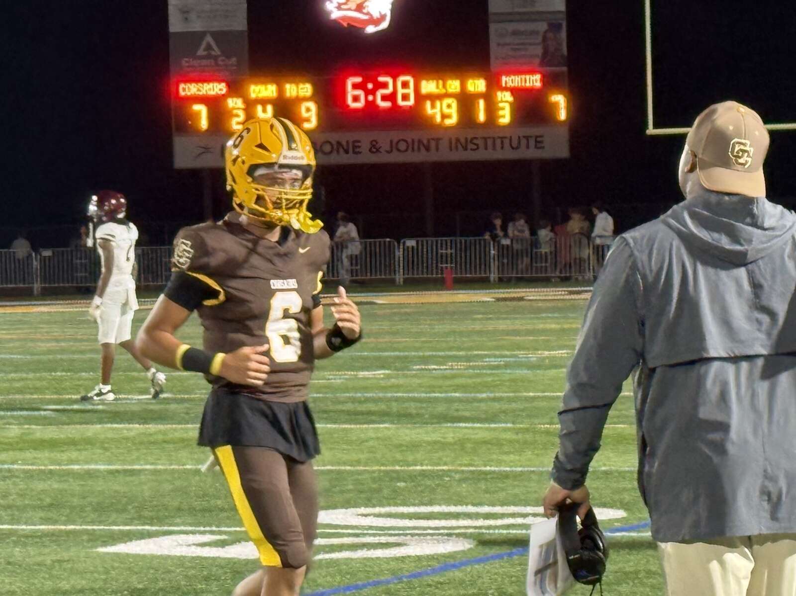 There was nearly a fifth lead change, but after Carmel scored with 27.1 seconds left on a 58-yard pass from Taylor to Kyron Hart. The Corsairs went for 2 and the win. Taylor dumped a short pass to Kai Owens. He was hit just short of the goal line by Montini's Nico Castaldo to secure the lead.