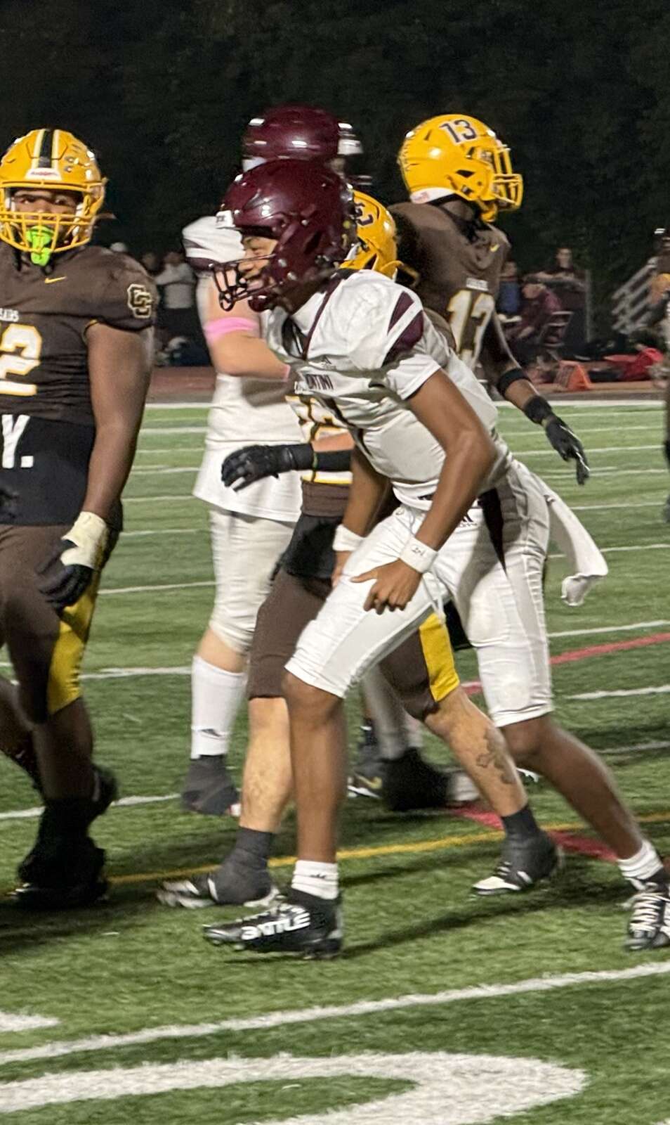 Montini quarterback Israel Abrams gets up after a running play Friday against Carmel in Mundelein. Courtesy of Mike McGraw