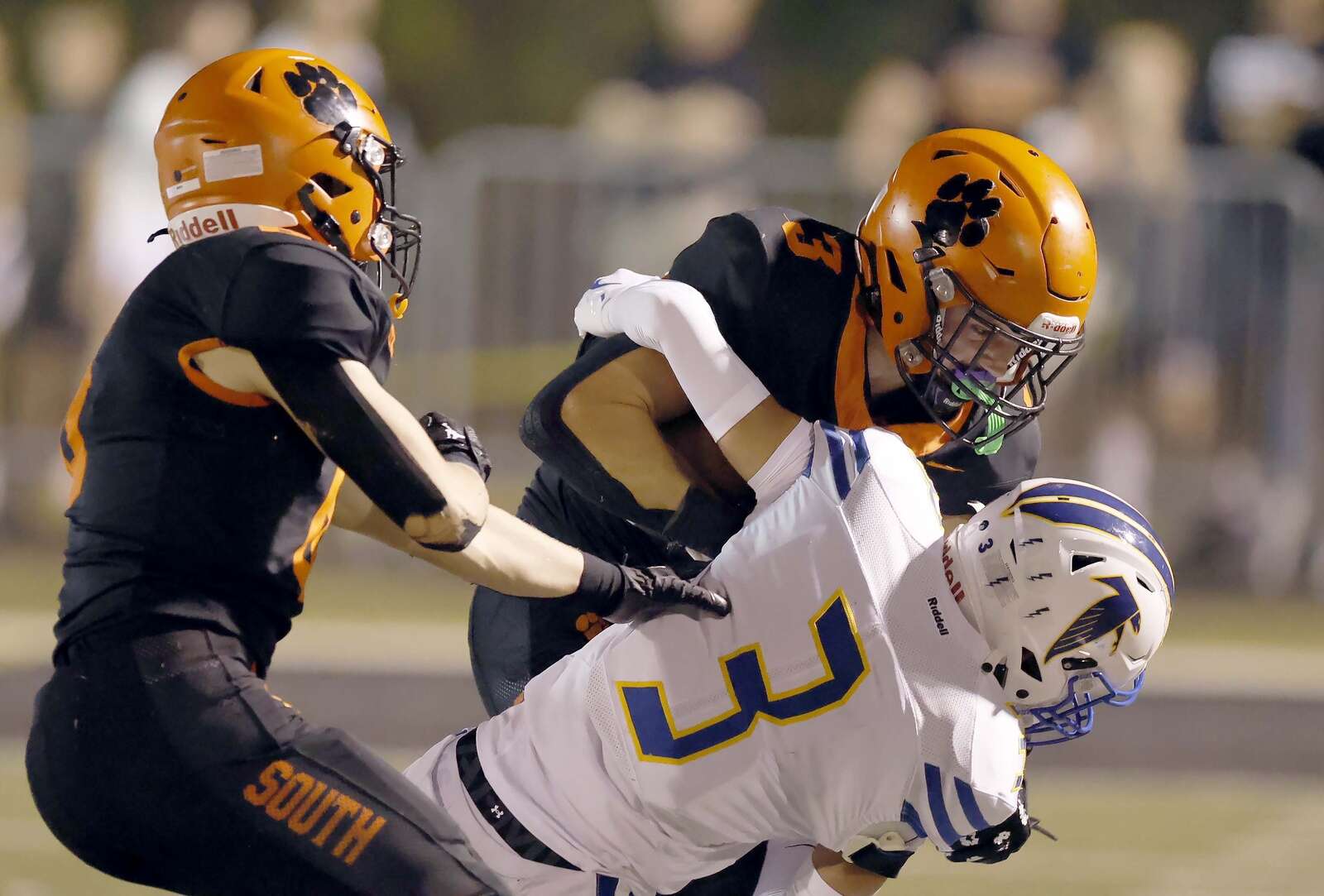 Although the Tigers (4-2, 3-1) had a 7-0 lead at halftime, Wheaton Warrenville South’s Justin Miller and Wheaton North’s Burke Neibch had combined to complete nine of 16 passes for 55 yards at that point.