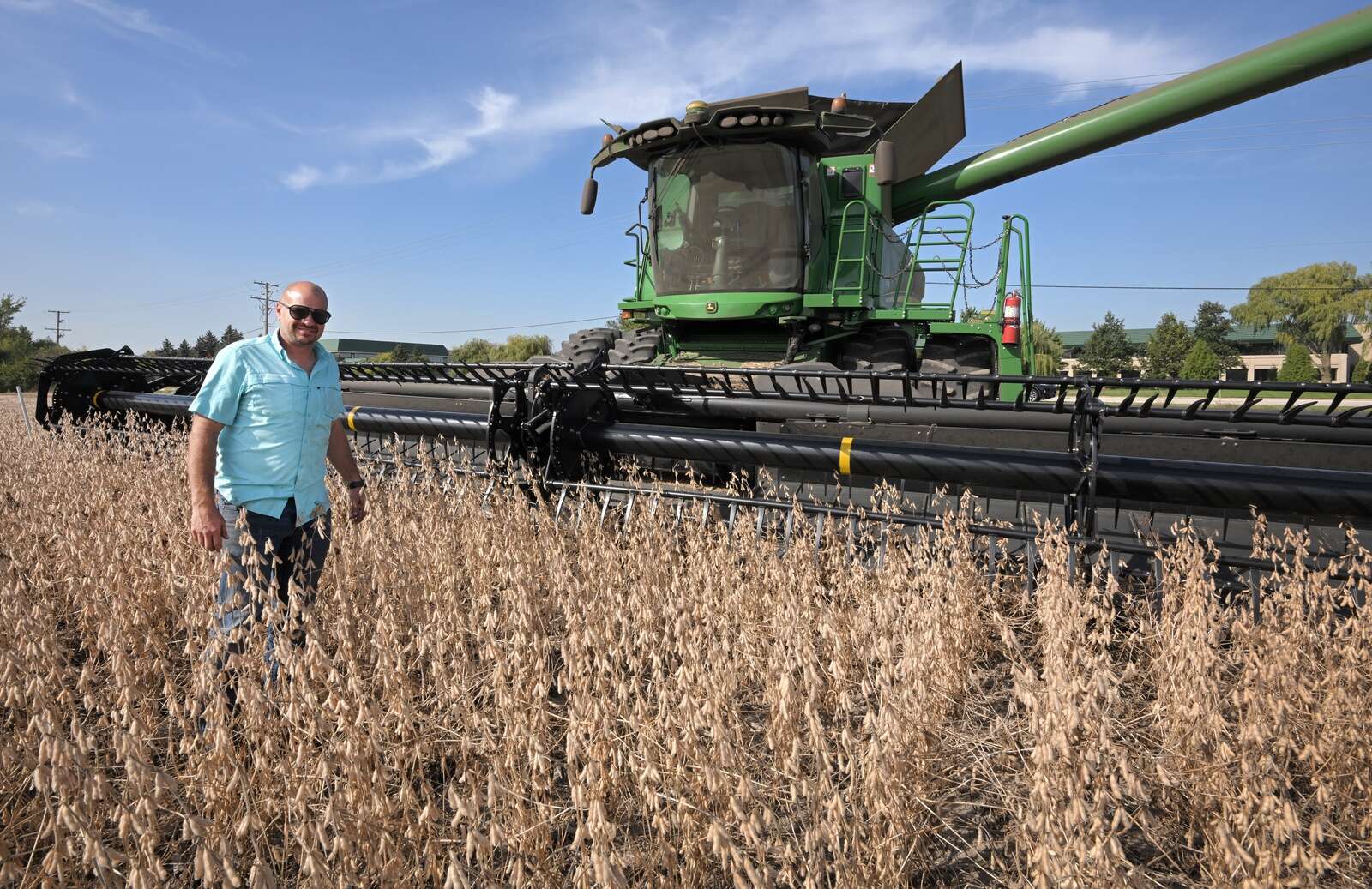 Andy Yarc stands in soybeans with his harvester in one of his fields near North Chicago. John Starks/jstarks@dailyherald.com