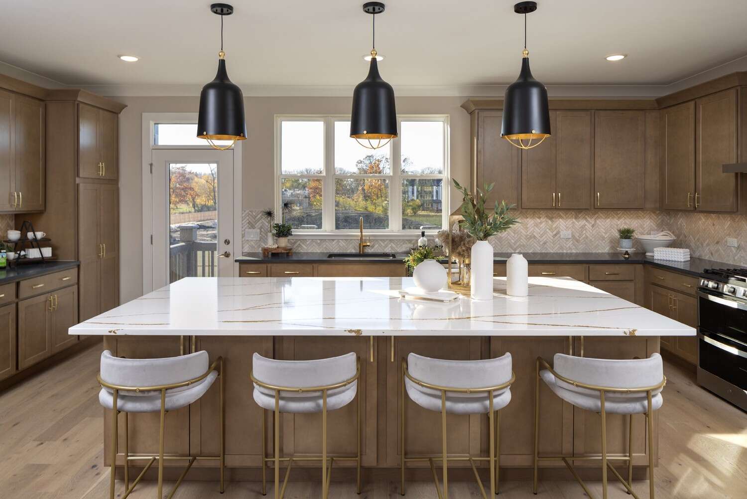 The townhouses’ exterior architecture blends English elegance with a modern aesthetic, including a black and gray color scheme, brick accents, gabled rooflines and lap siding, along with large six-pane windows for enhanced natural light throughout the home.