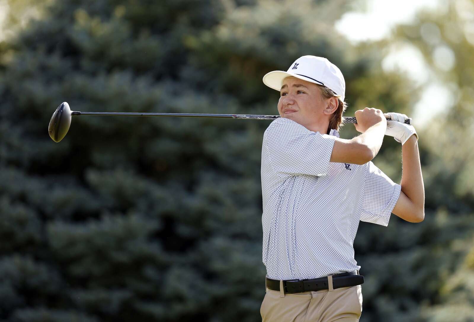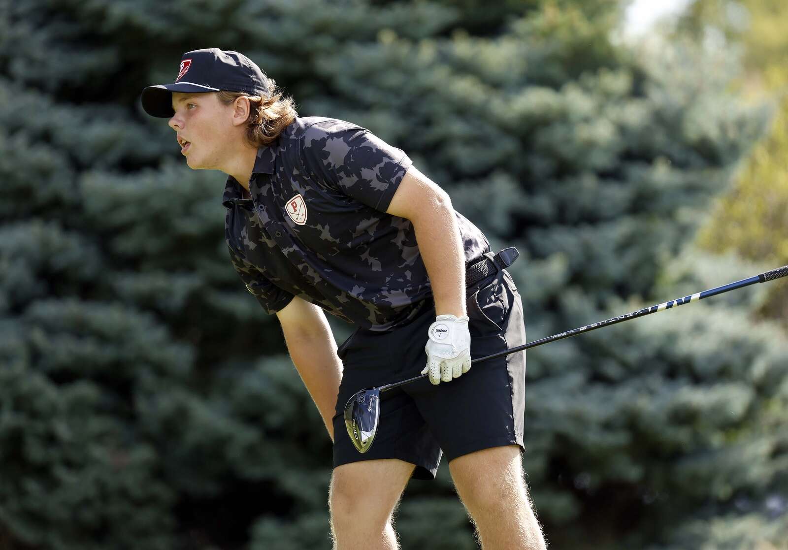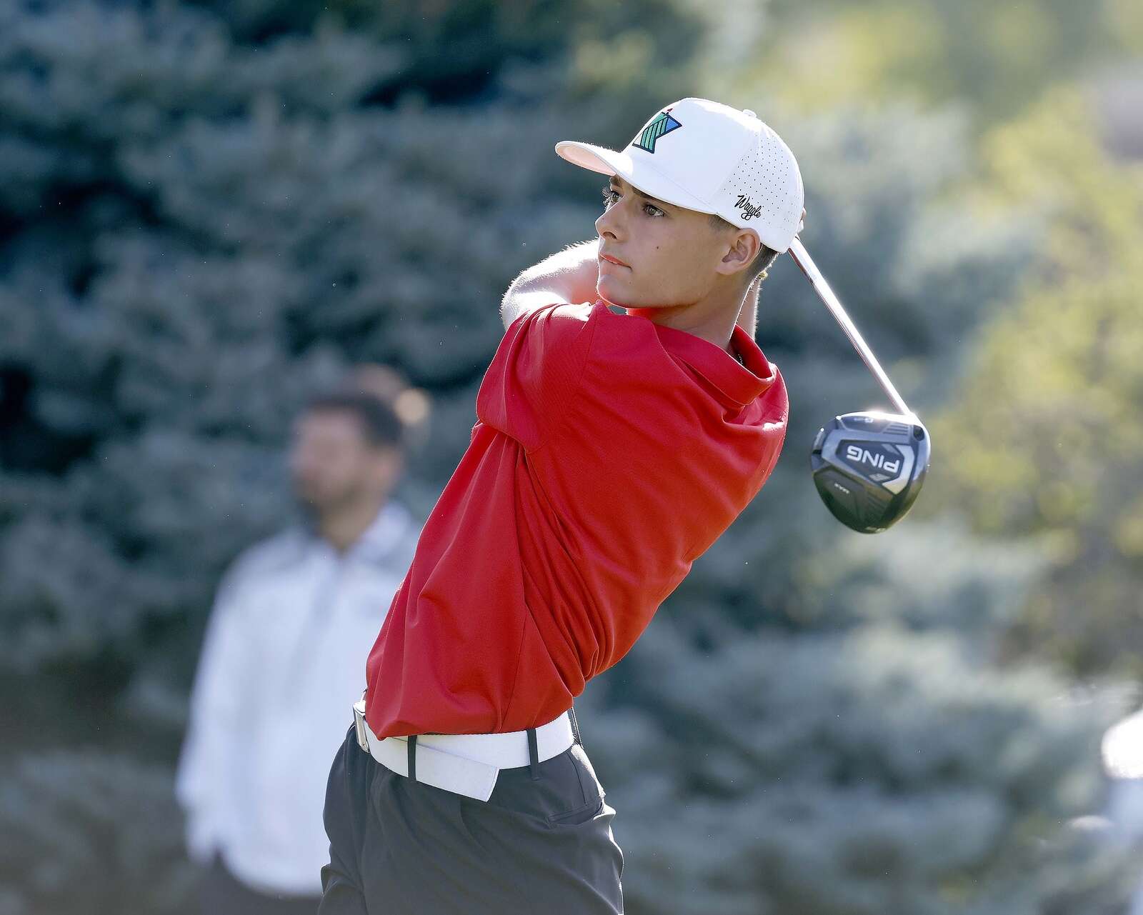 Bryson Landerman of Palatine watches his tee shot during the Class 3A boys golf sectional Monday, Oct. 6, 2025 at the Buffalo Grove Golf Club in Buffalo Grove. Brian Hill/bhill@dailyherald.com