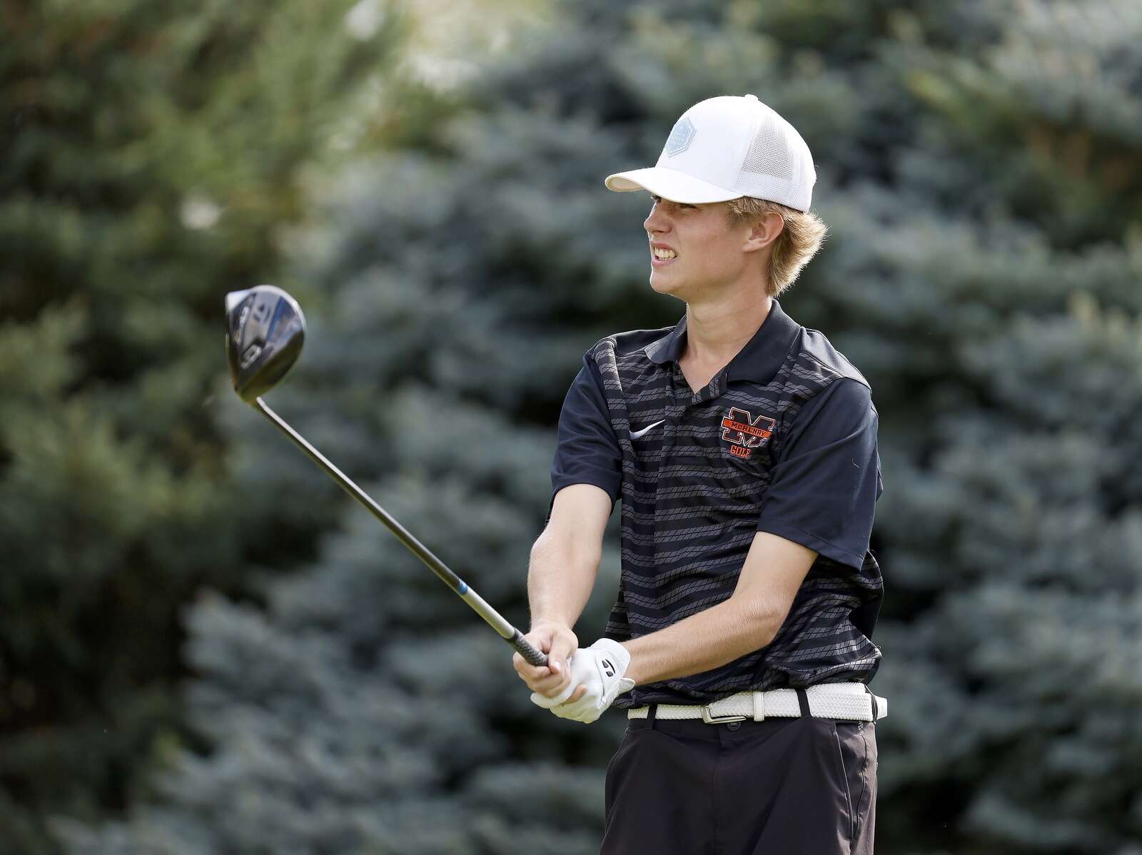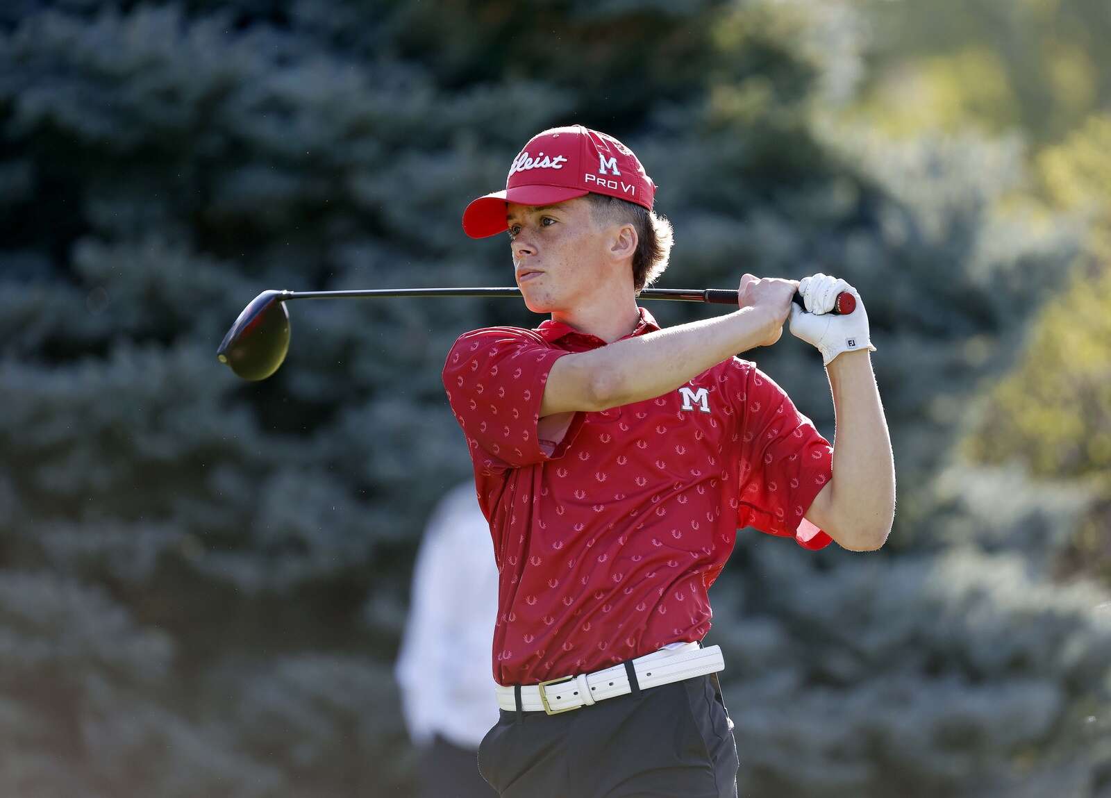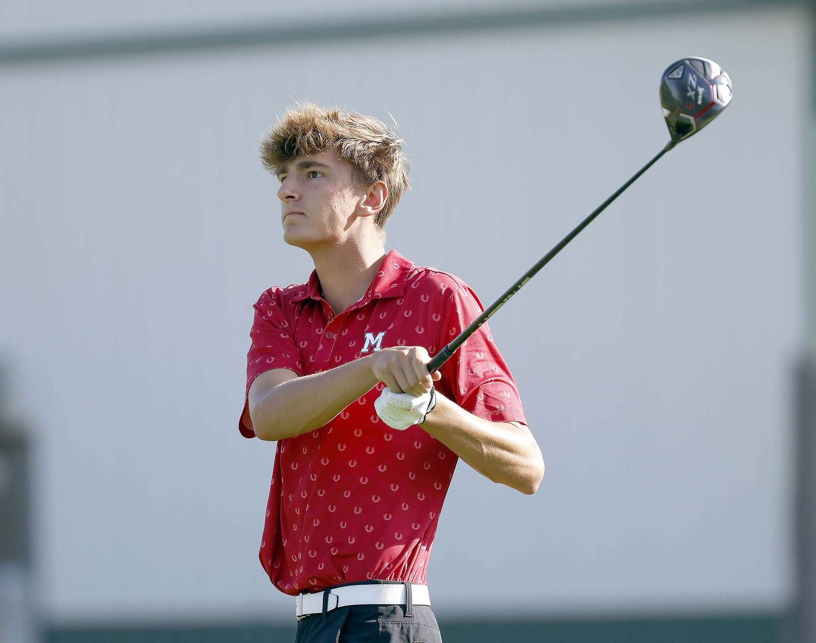 Carson Koenigsknecht of Mundelein watches his tee shot during the Class 3A boys golf sectional Monday, Oct. 6, 2025 at the Buffalo Grove Golf Club in Buffalo Grove. Brian Hill/bhill@dailyherald.com