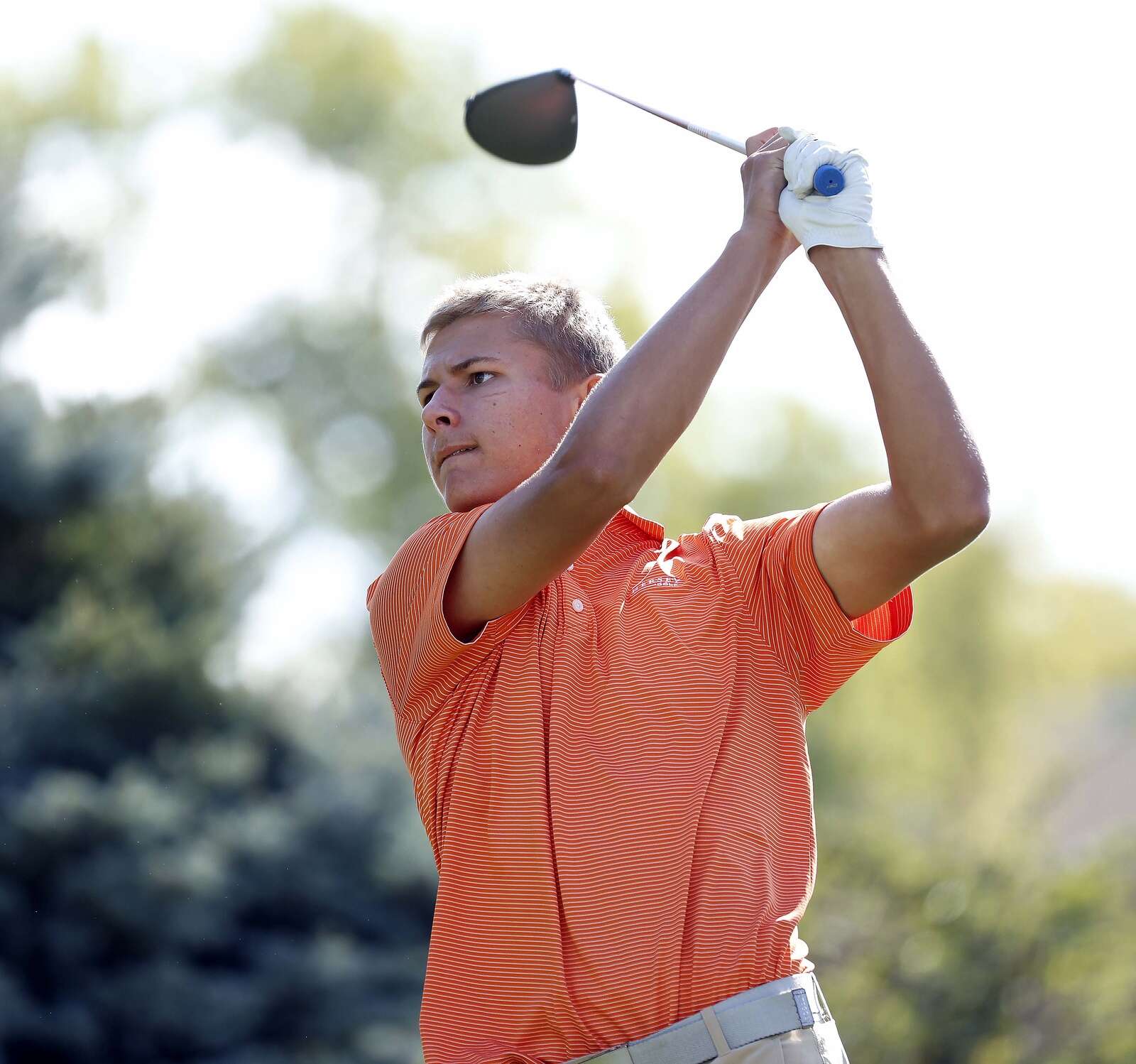 Griffin Winstead of Auburn watches his tee shot during the Class 3A boys golf sectional Monday, Oct. 6, 2025 at the Buffalo Grove Golf Club in Buffalo Grove. Brian Hill/bhill@dailyherald.com