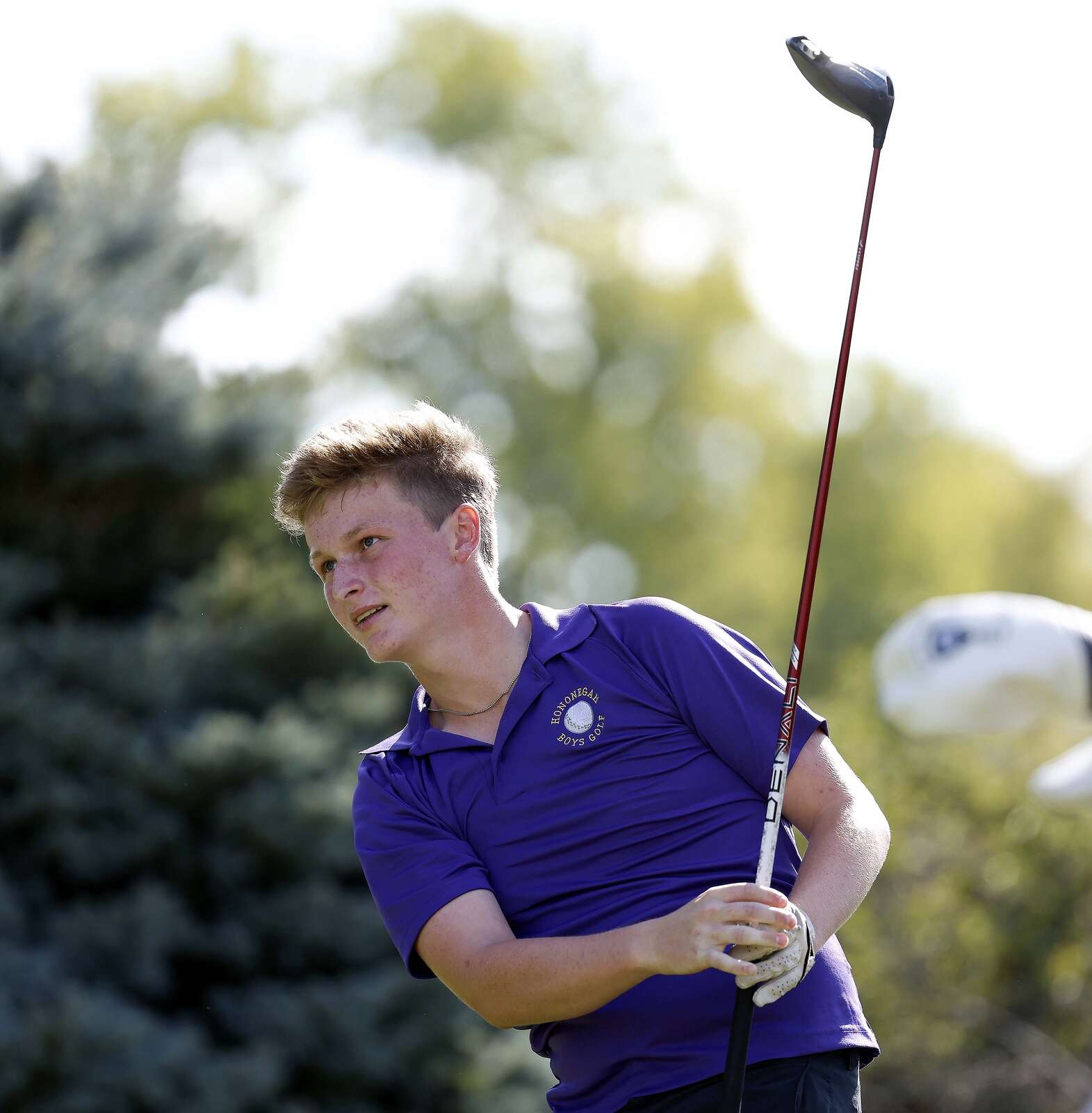 Logan Henning of Jacobs watches his tee shot during the Class 3A boys golf sectional Monday, Oct. 6, 2025 at the Buffalo Grove Golf Club in Buffalo Grove. Brian Hill/bhill@dailyherald.com